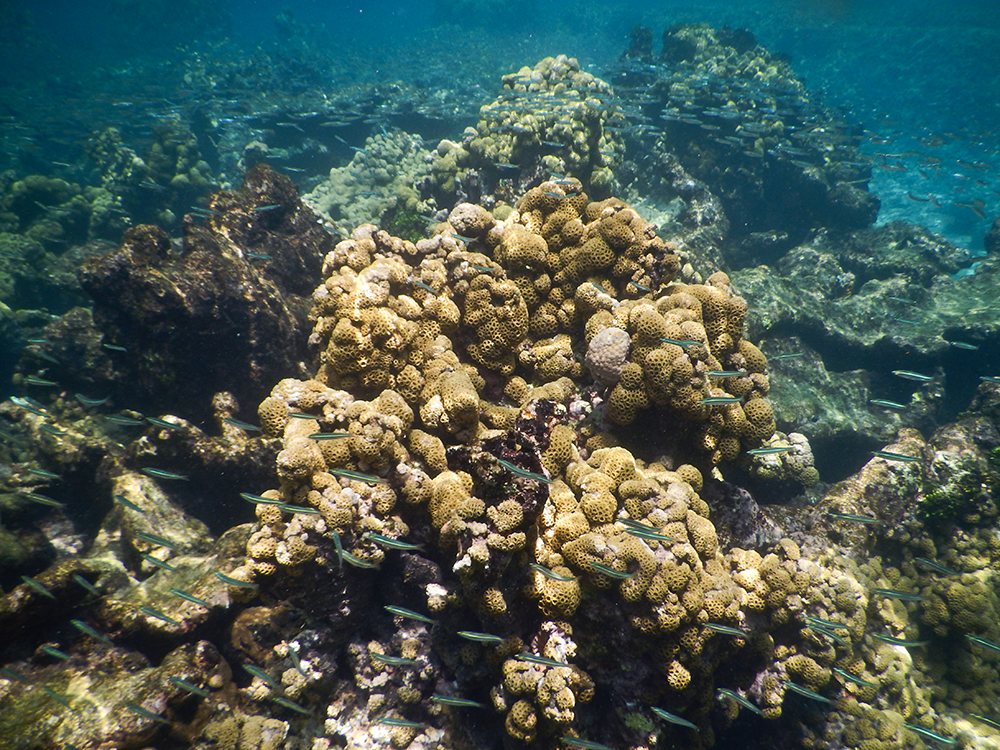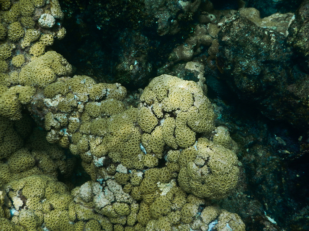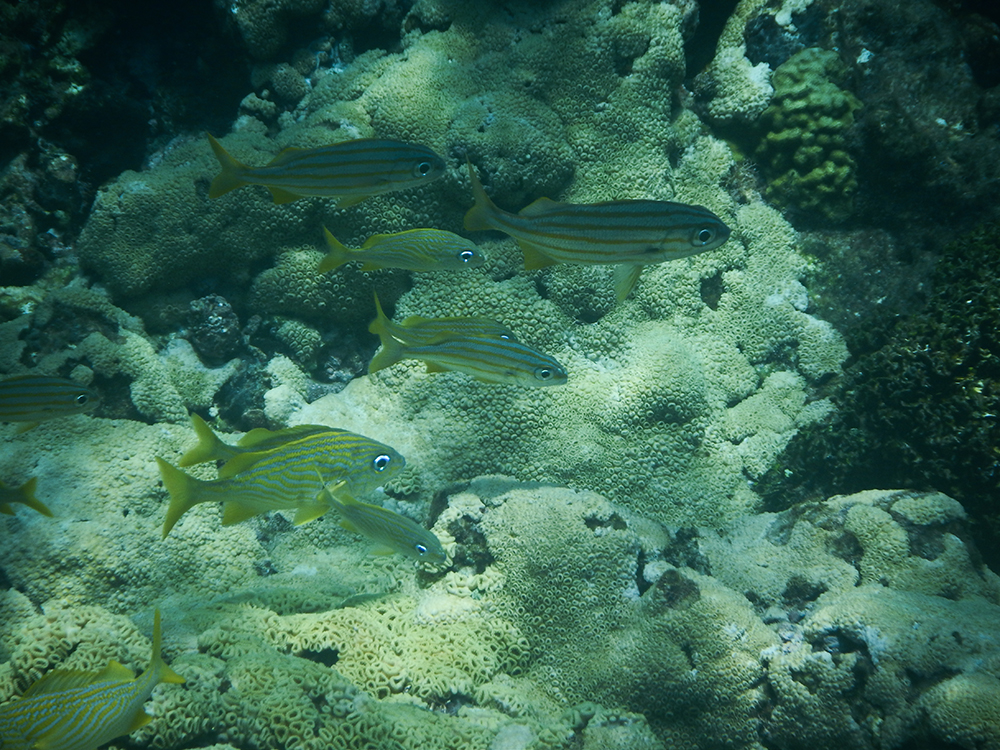 After settling in, we meandered over to the beach, and spent some time relaxing in lounge chairs and swimming until a small boat pulled up to the beach to let off a couple of other vacationers. We saw snorkel gear on the boat, and approached the driver to ask for a tour. Soon we were cruising to a nearby snorkel spot, where we jumped in and were amazed by the endless array of golfball corals. We snorkeled around in this location for a while, bumping into harmless comb jellies, before climbing back into the boat to go to a second location. This spot was right next to a small island that we could see from the resort beach. There were more fish and more corals at this location, and we especially enjoyed swimming along the side of the little island. The wall of the island was covered in coral, and it dropped abruptly to about 15 feet deep. I loved watching the waves crash against the side of the island from underwater.