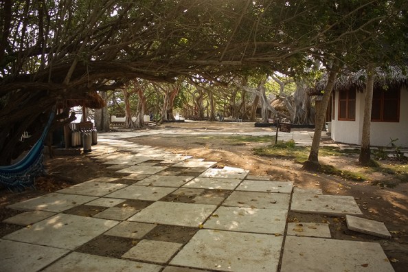 After returning our kayaks, we still had a bit of time before the ferry would arrive to take us back to Cartagena, so we used it to walk around the island one last time, heading into the woods to pass by some of the colorful buildings and the elaborate banyan trees.