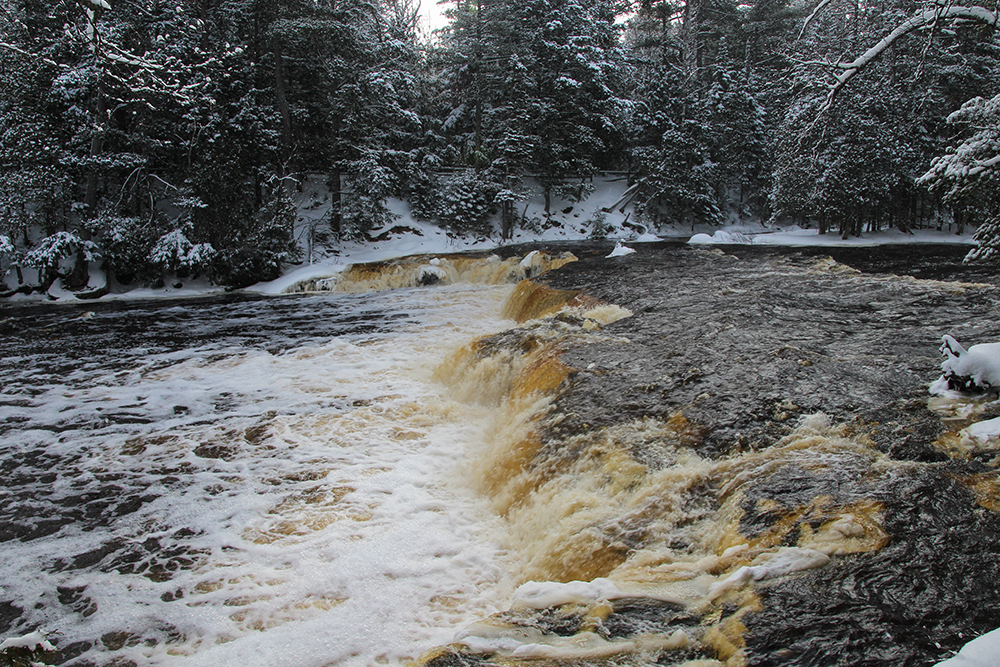 Next we drove to Tahquamenon Falls State Park, and found a spot in the upper falls parking lot. We hiked the snowy, yet short trail to the falls viewing areas where I got to try my new neutral density filter for the first time, and took some long exposure pictures of the falls. Upper falls is impressive in size, and it can be rather hypnotic to watch the rich brown waters cascading powerfully over the large ledge. The brown color of the water is caused by tannins that drain into the Tahquamenon River from nearby cedar swamps. We ate a late lunch at Tahquamenon Brewery, where I had a very satisfying pasty. We rounded out the day by visiting Sault Ste. Marie, which, as it turns out, doesn’t have much going on in the winter months.