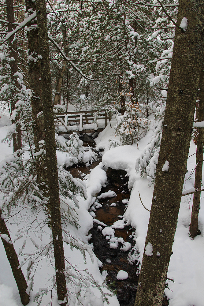 Sunday morning we woke up to six inches of fresh snow and sunshine. We drove to the lower falls parking lot, and bundled up for the longer hike to get down to the river. The forest was magical with its blanket of fresh snow and we had a lot of fun hiking through the snow drifts on our way to the much smaller lower falls.