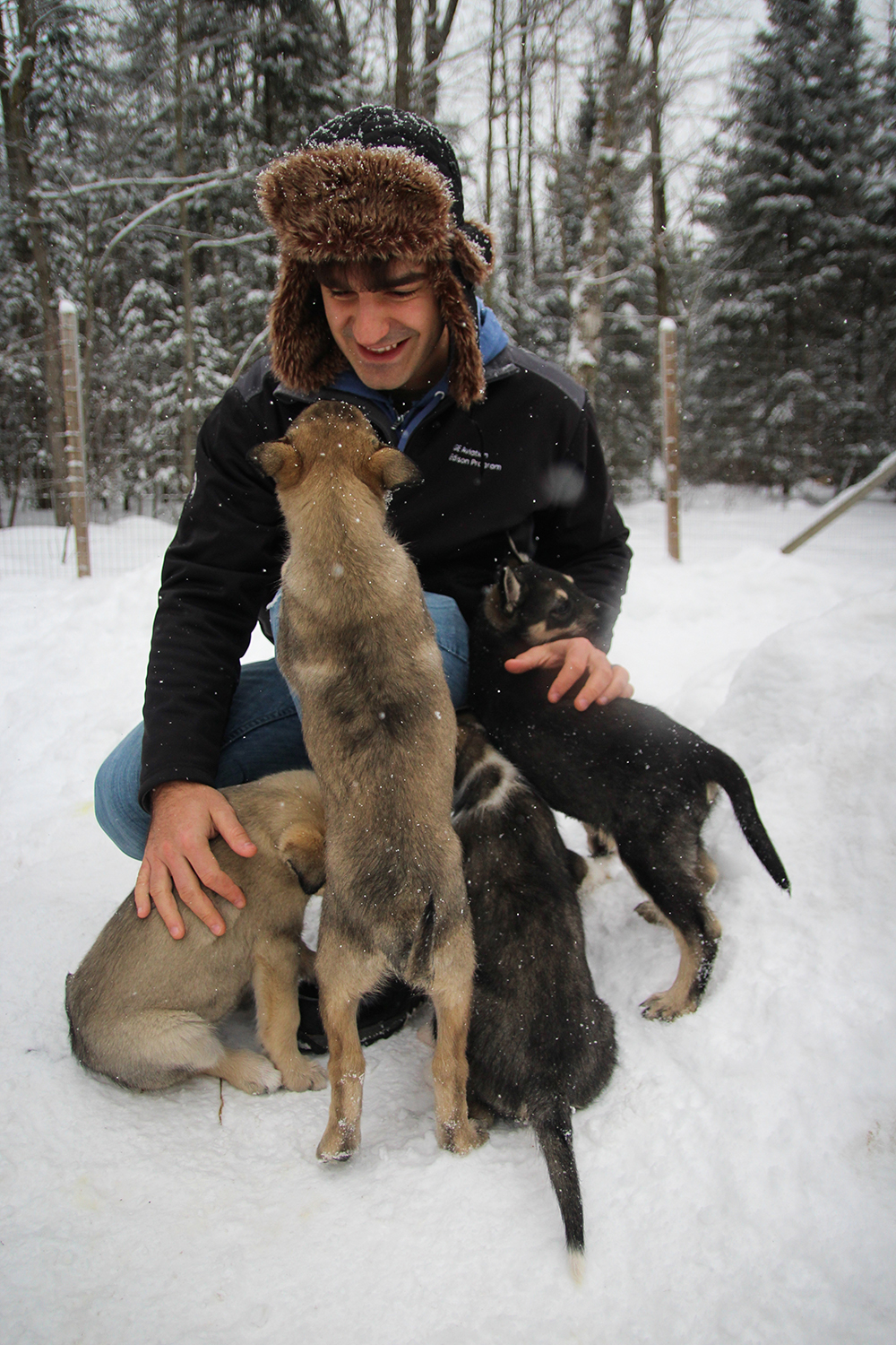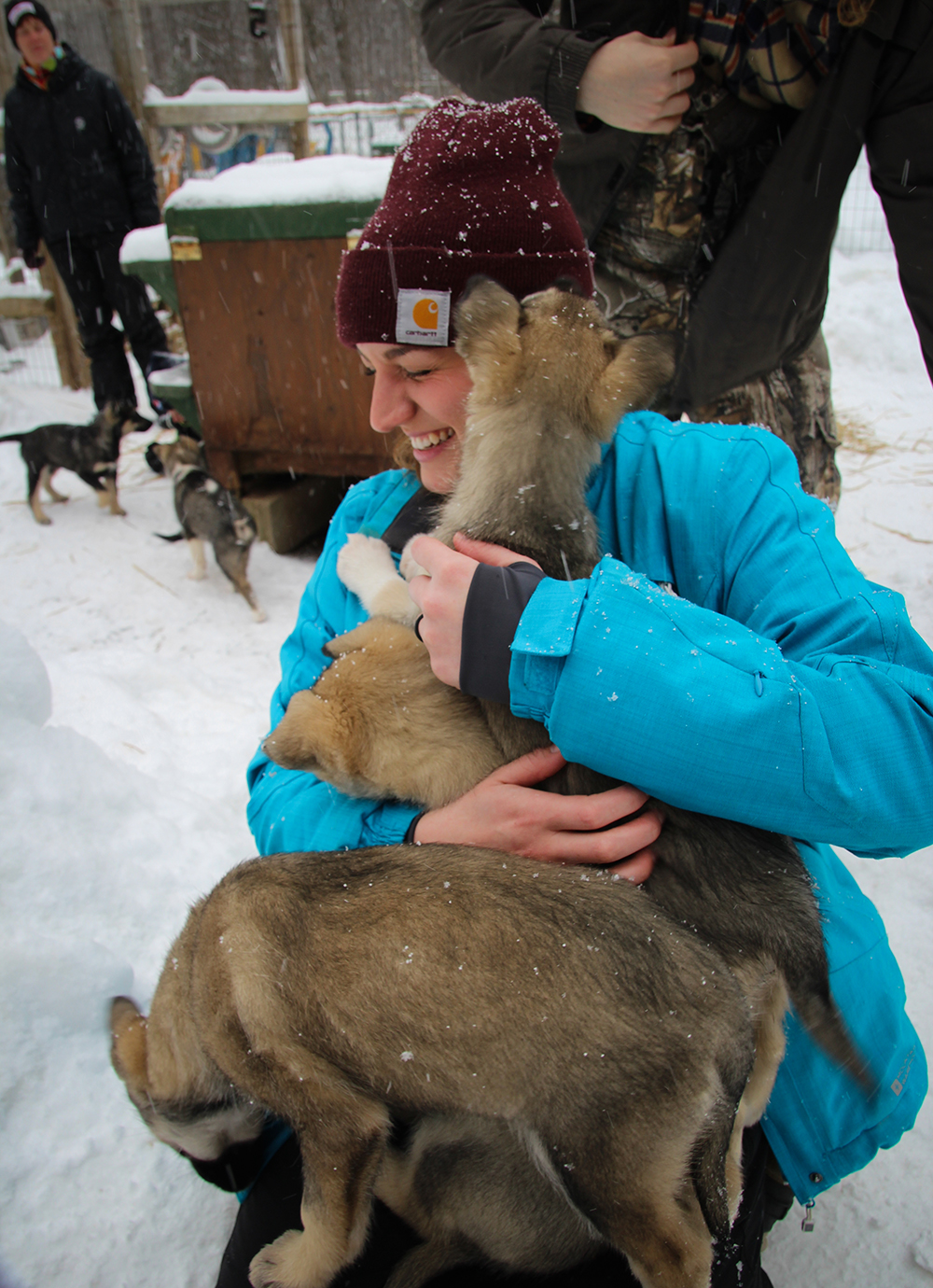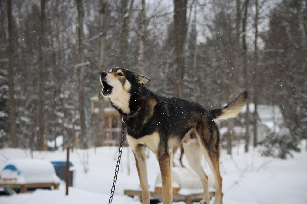 After we tore ourselves away from the puppies, we got to see a bit of the surrounding forest as Tasha pulled us in a sled attached to a snowmobile. Then we returned to the house just in time to watch a few teams take off for the day. As the mushers got the dogs ready to run, they became increasingly excited until they were jumping up and down in anticipation. When the teams finally left the yard, all of the dogs that were left behind barked and howled in excitement.