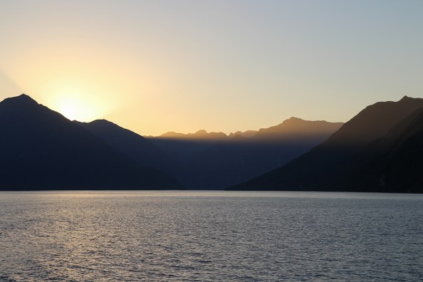 We turned back before long, wanting to eat dinner before meeting up for our excursion with Real Journeys. We didn’t have to wait long to board a ferry that would take us to the cave, and while on board, we got to watch the sun setting behind the mountains that bordered the lake.