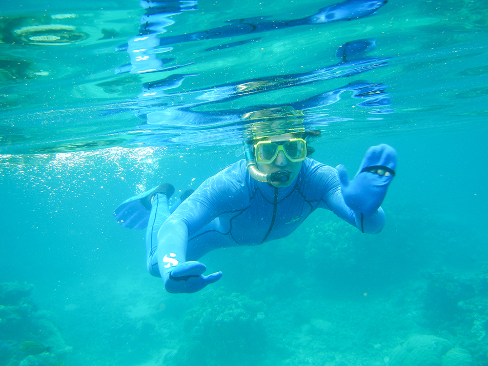 The rest of the morning was filled with safety briefings, and a short presentation by the expedition’s marine biologist, who was offering a guided snorkel for 25 AUD a person. Vince and I decided to add this to our day to appease my obsession with anything and everything ocean related. Then we were called for a meeting with our dive instructor who gave a much more serious talk about how to use our equipment and stay safe on our introductory dive. In all honesty, I was beginning to wonder what I had gotten myself into at this point. I had been dreaming of trying SCUBA diving since I was a kid, but faced with the immanency of actually doing it, my mind began to formulate every worst-case-scenario in the books. I was incredibly nervous as we donned our stinger suits and walked onto the swim deck where guides helped us on with our weight belts and oxygen tanks. The weight of all of the gear was suffocating and did nothing to calm my frazzled nerves. We were in the second group of divers and would have to undergo a short safety test near the surface of the water before we would be allowed to go deeper. Although my heart was pounding, I slid right into the water when our turn was announced, and started breathing through my regulator. To my great relief, all of my anxiety faded the moment I sunk under the glassy surface. I had no trouble breathing through the regulator or clearing my ears, and I passed the safety check with ease. After that, our guide escorted us deeper into the water, and we stared in awe at the beautiful corals that surrounded us. The dive felt like it flew by once I became comfortable, and when our turn was over, we grabbed our snorkels and jumped back in the water to explore more.