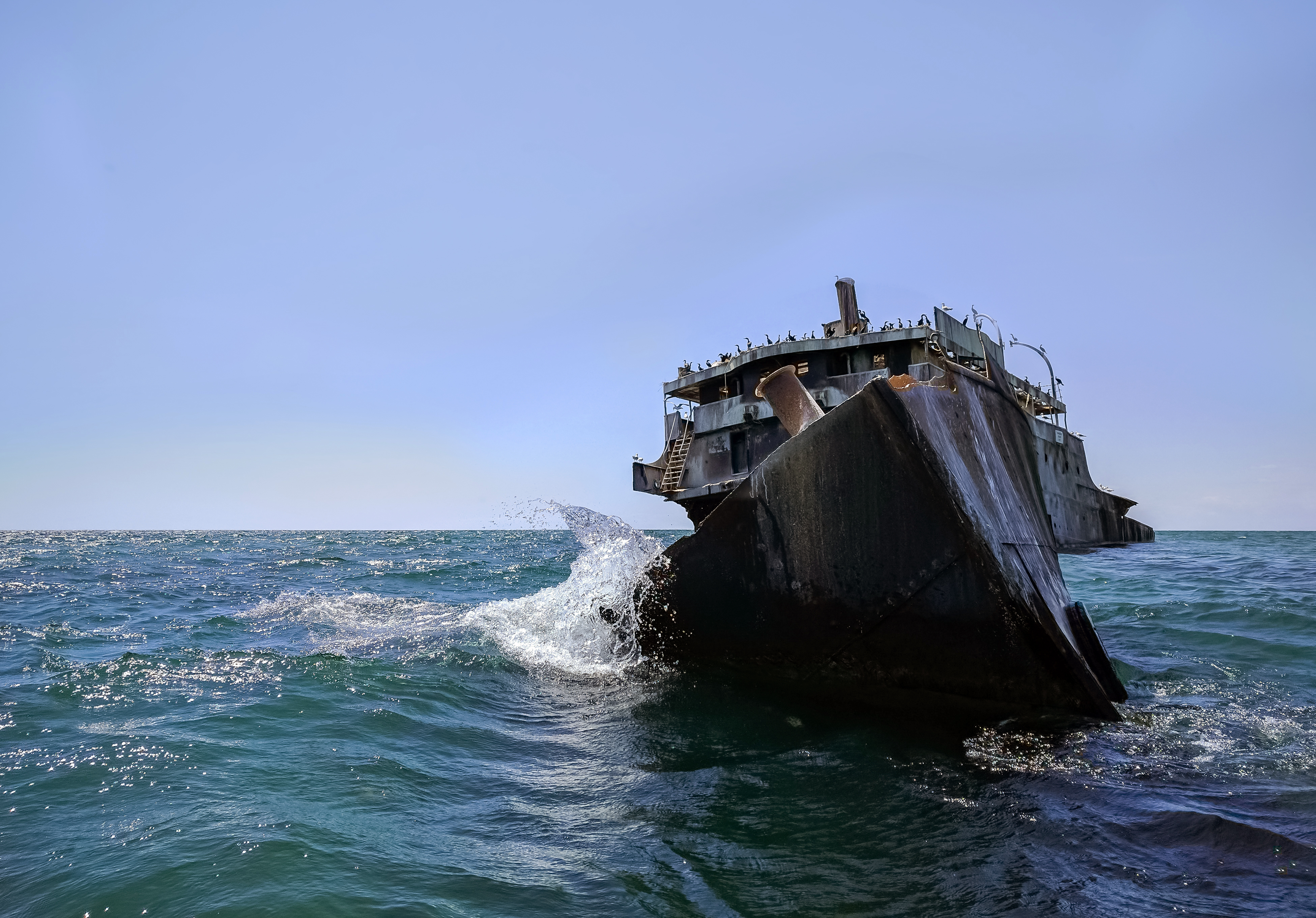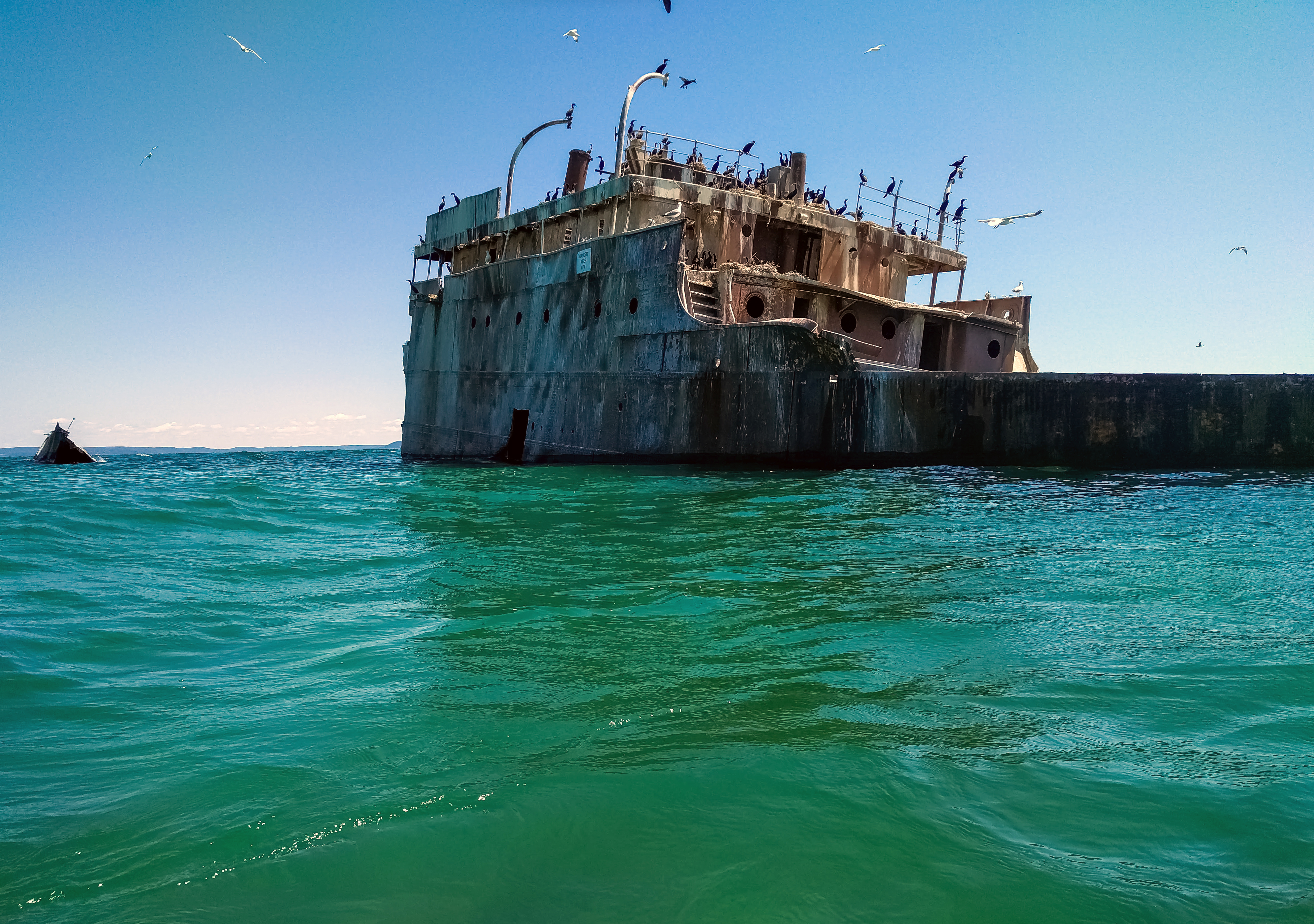 Any worries about the temperature were completely replaced with the fear of contracting swimmer’s itch or giardia, so I didn’t balk at all once submerged in the churning water. We made good time closing the distance between us and the wreck, and with the help of my fins, I was mostly able to keep up with Jordi. Soon we were paddling in the shadow of the Morazan, feeling the icy glares of the sentinel shorebirds, leerily guarding their nests above us.