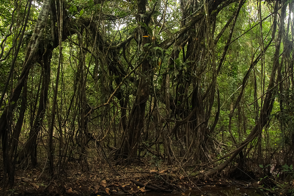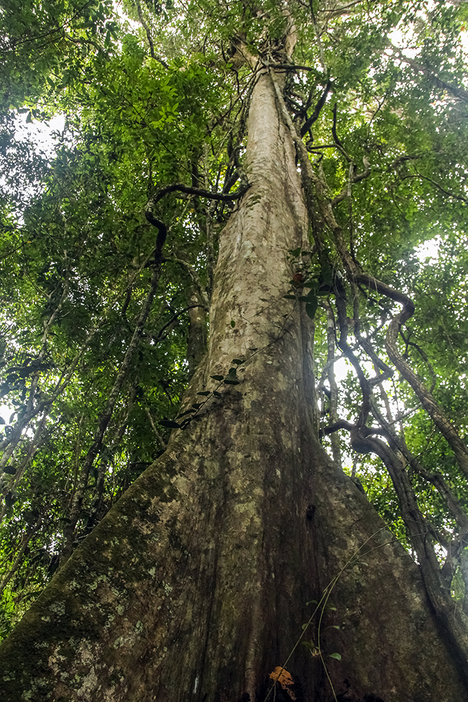Soon, Katoo returned and he had figured out how to get back to the trail. We sluggishly made our way back. Walking without a trail was clumsy and slow in our gumboots, and we had to contend with ducking between vines that grew from the canopy all the way to the ground.