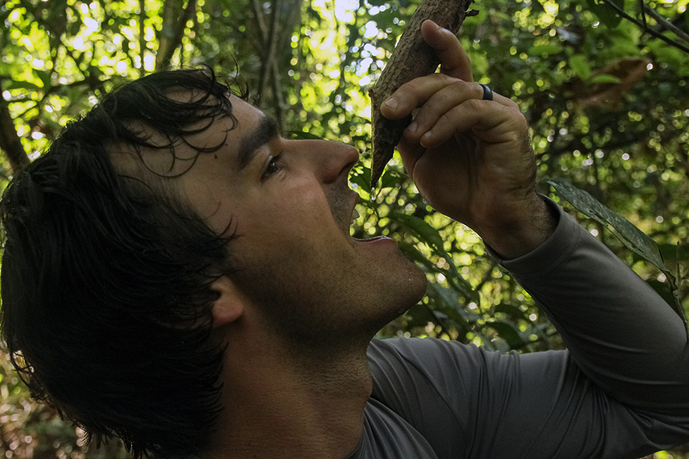 During the first part of the morning, Katoo showed us a lot of small things that we should look out for on our hikes. For instance, he pointed out a tree that had no vines growing on it. The tree was inhabited by a colony of fire ants, who meticulously maintain their homes, keeping any other foliage from growing on them. He also pointed out a gigantic ant called a bullet ant. These are highly venomous, and Katoo told us about undergoing his bullet ant ceremony while growing up in the Brazilian Amazon. Another tiny, but terrifying swarm of creatures we found on our hike were some small beetles. Katoo said that he had once been blinded for two months when one of these shot venom into his eyes.