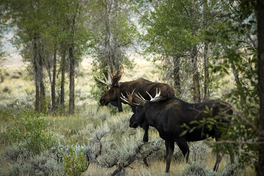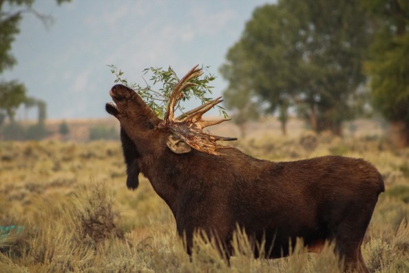 There were three bull moose and one cow. The males were all working hard to rub the velvet off their antlers, but the largest of the three had clearly found the most success. We observed from a safe distance as the three bulls all vied for the attention of the cow, who seemed utterly disinterested in the lot of them.