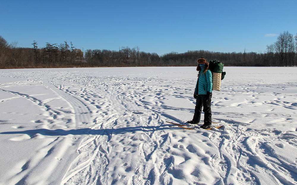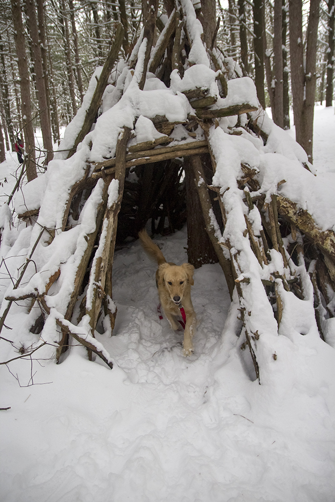 Last winter my brother’s girlfriend, Courtney, made an awesome pair of old fashioned snowshoes. When she asked if I wanted to try them out, my obvious answer was yes, so the two of us and my brothers packed up a car and headed out to “The Prop.” This is what we’ve nicknamed the 40 acres of undeveloped land that my dad and uncle have owned since before I can remember. We spent the day hiking around in the snowshoes, which I found to be much more lightweight and easier to maneuver than any of the modern ones I’ve tried. My brother David got some ice fishing in, and my brother Caleb built a fire which was a welcome relief from the frigid temperatures.