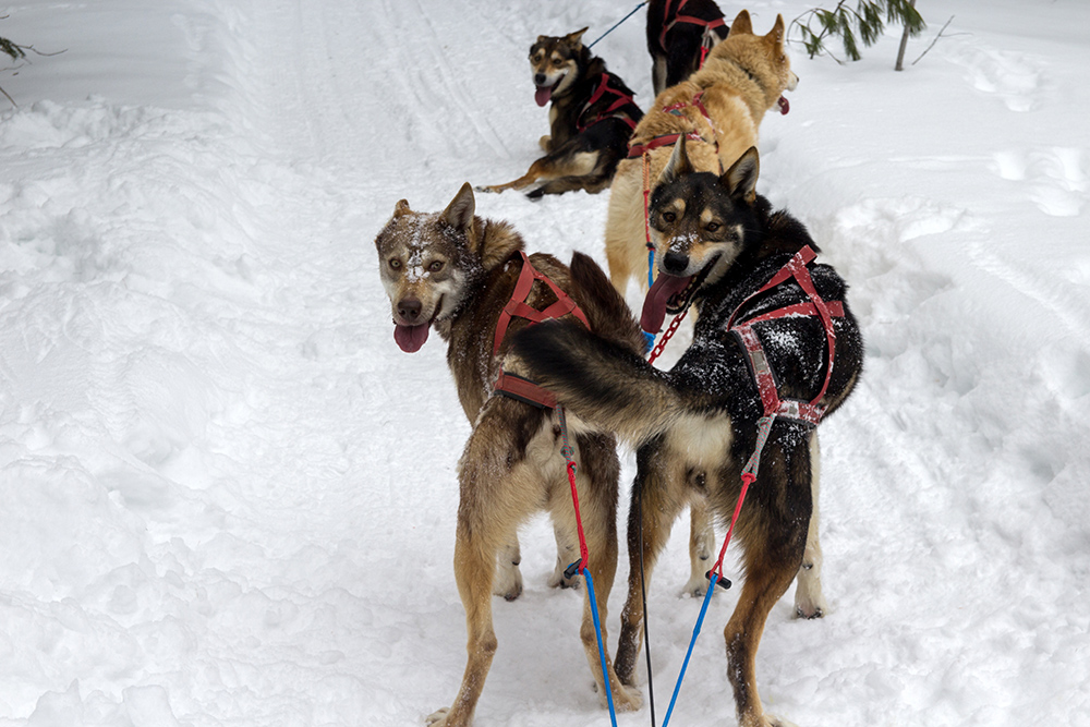 We arrived at Nature’s Kennel in the late morning and were ushered into a cabin to sign waivers and borrow boots. Then our guides, Matti and Justin, lead us out to the yards. After a meet and greet with the dogs, Matti gave us a rundown on how to control our sleds. David, Caleb, and Courtney went with Justin, and Matti began to show me and Vince how to harness our dogs. I watched as Matti and Vince harnessed his team. The dogs were easy to get in line and soon it was my turn to get ready.