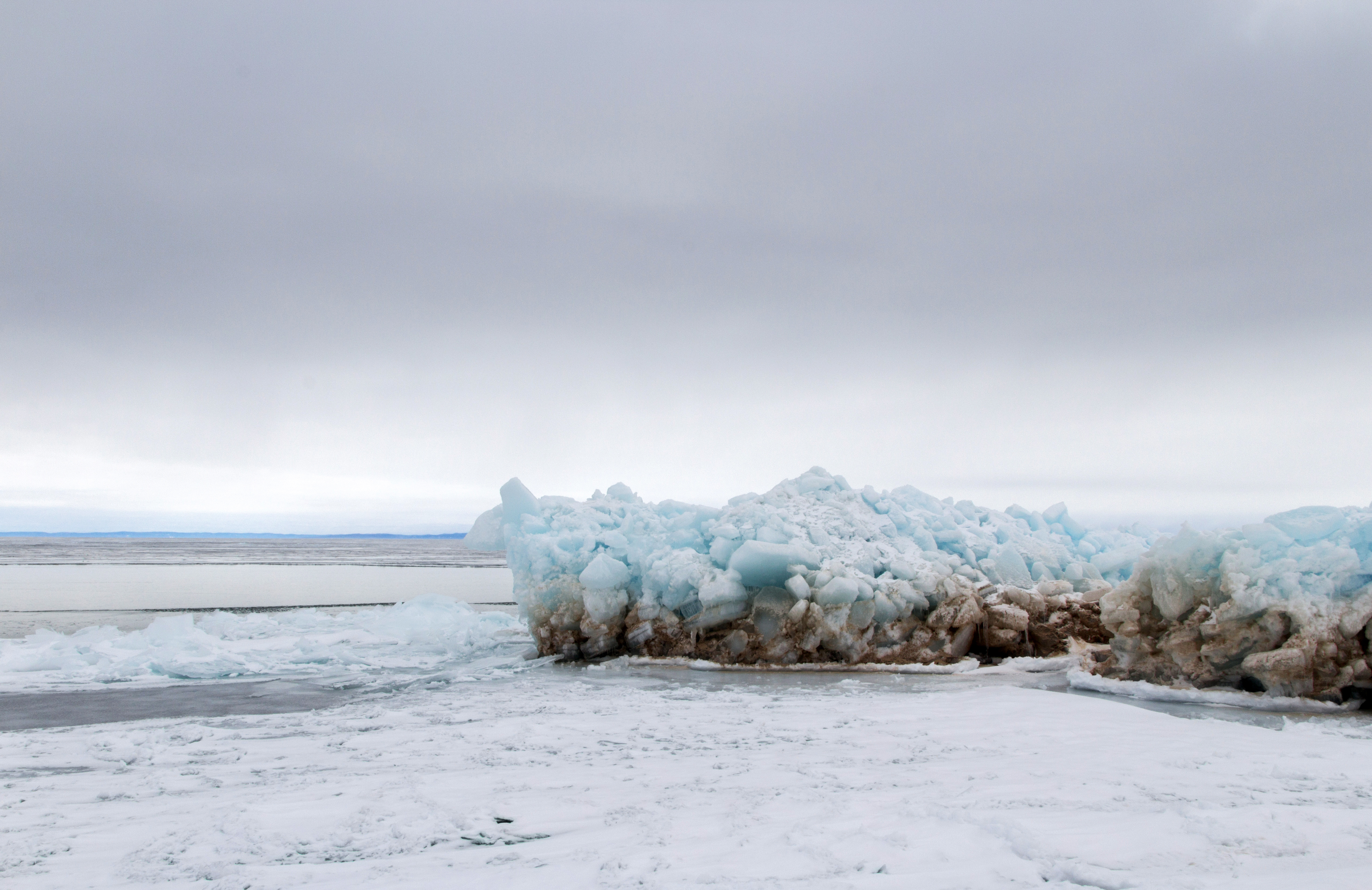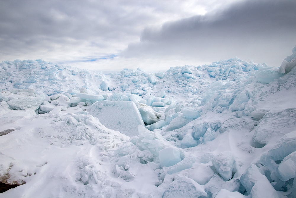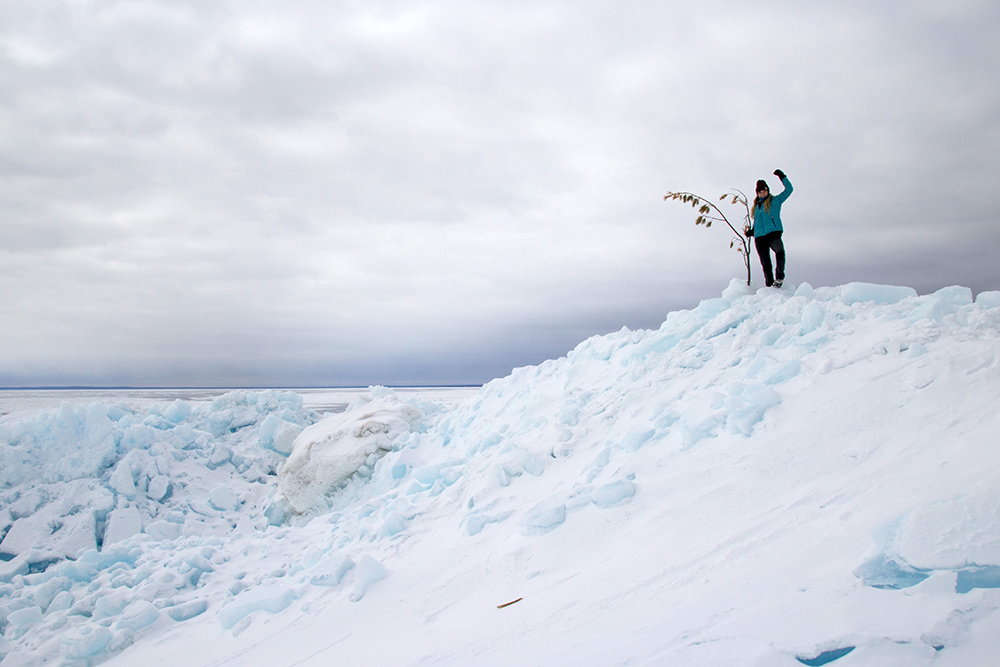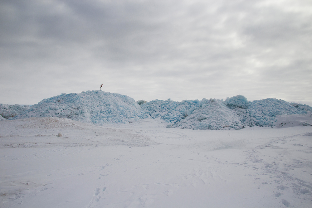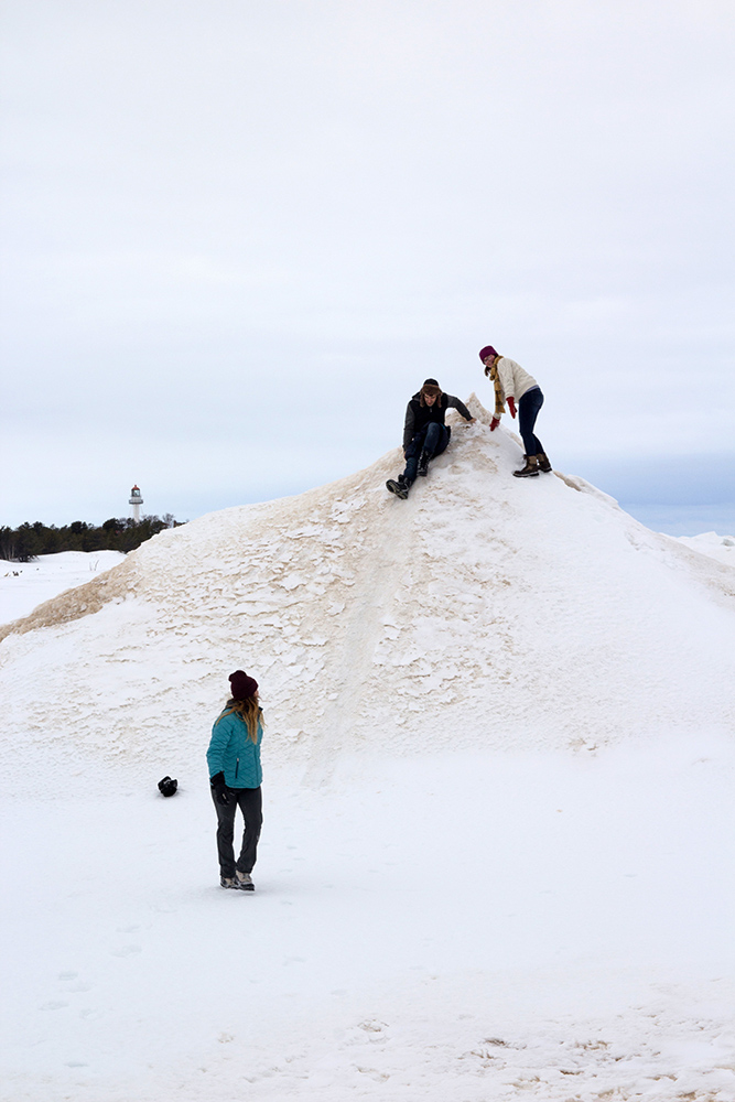 Blue ice piled up, crunching against gentle snowy hills at the shoreline, and Canada was visible across the lake. When my brothers and I are together, it doesn’t take much for us to revert to a childlike spirit of adventure, and this fantastic setting pushed us into our own little world. Out on the ice we weren’t a group of siblings in Michigan, we were Antarctic explorers conquering new ground and putting up first ascents. We began scrambling up snowy volcanoes and shouting “FIRST TO SUMMIT!” at the top of our lungs. Off in the distance to the east, we could see a massive pile of blue ice looming on the horizon. We immediately knew that we had to get to it and climb to the top.