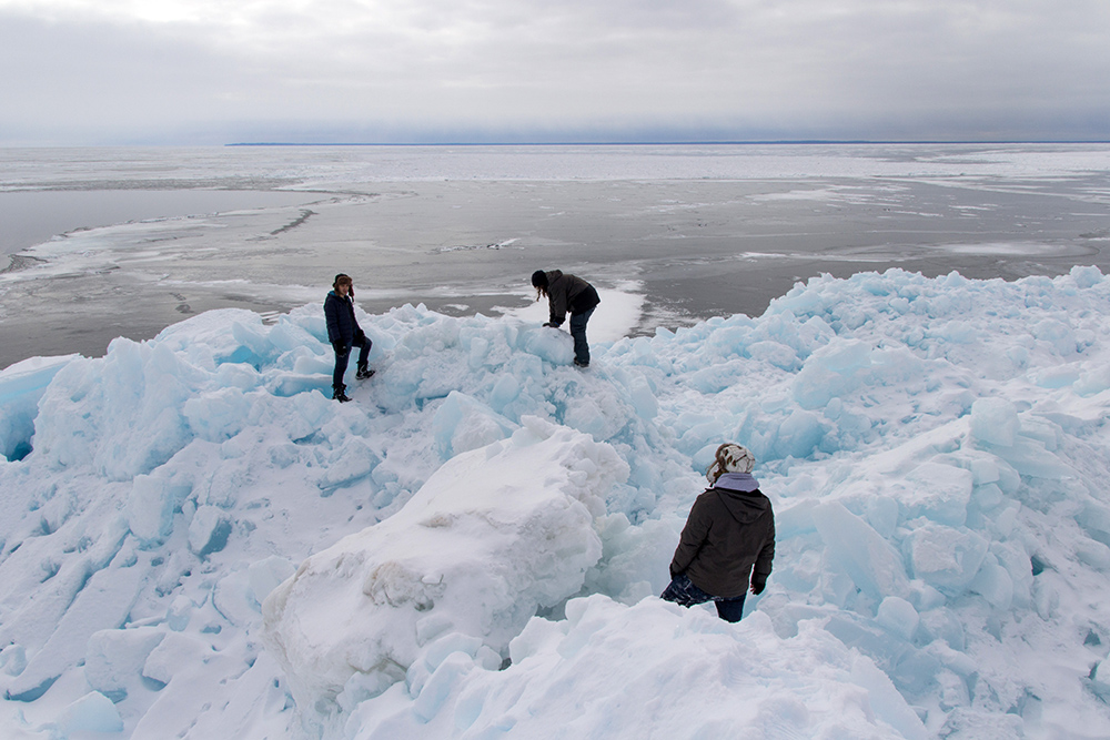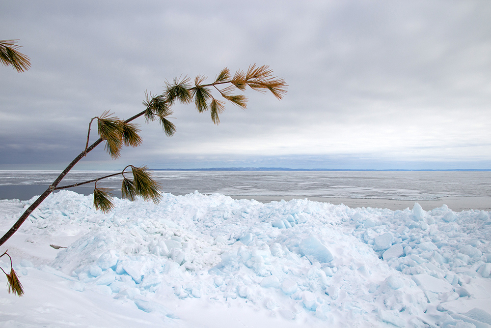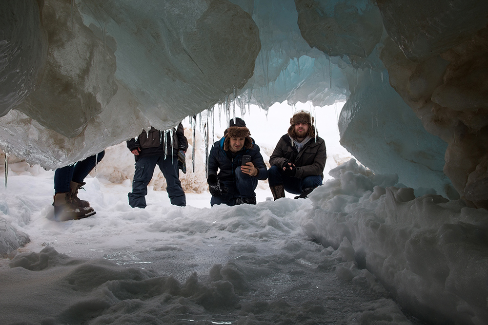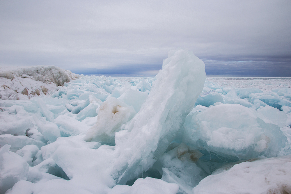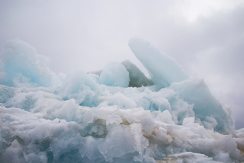 Blue ice piled up, crunching against gentle snowy hills at the shoreline, and Canada was visible across the lake. When my brothers and I are together, it doesn’t take much for us to revert to a childlike spirit of adventure, and this fantastic setting pushed us into our own little world. Out on the ice we weren’t a group of siblings in Michigan, we were Antarctic explorers conquering new ground and putting up first ascents. We began scrambling up snowy volcanoes and shouting “FIRST TO SUMMIT!” at the top of our lungs. Off in the distance to the east, we could see a massive pile of blue ice looming on the horizon. We immediately knew that we had to get to it and climb to the top.
