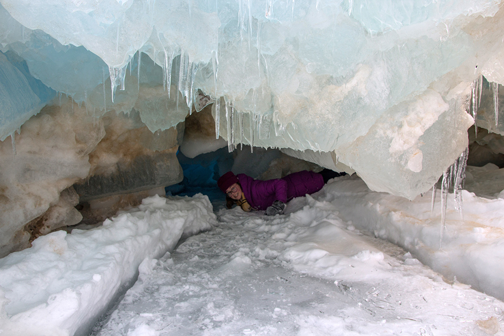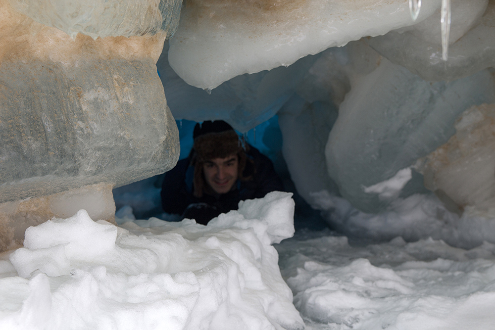 Eventually we came to a smaller, yet still impressive pile of blue ice (which Vince playfully dubbed “blice”) where Vince spotted a cave. He hopped down a short ice cliff to check it out, and the rest of us followed. Only one person at a time could fit into the cave and Vince went first, and when it was my turn I scooted along my belly into the depths of the cave. It was uncomfortable, wet, cold, and most of all beautiful. The world inside the cave was a deep turquoise blue, and the tunnel jutted off to another icicle-clad opening further away.