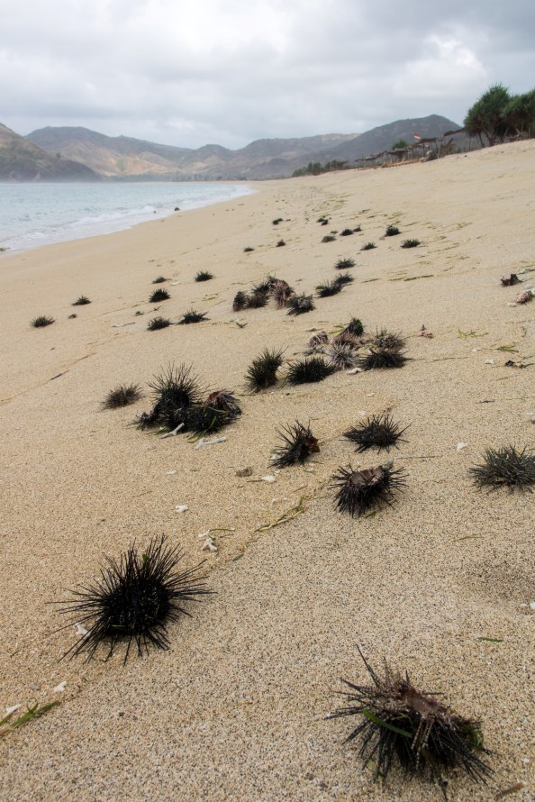 It was low tide at Pantai Tampah, the first stop on a day-long beach hopping tour that would eventually land us at the beach the Are Goling surfers had recommended. I am a bit obsessed with sea creatures, big and small, so Pantai Tampah was nothing short of delightful for me. When we first set foot on the beach I noticed the sand. It was very soft and was formed into almost perfect, porous, little spheres. After examining the particles I started to notice shells, then oddly shaped sand dollars and huge sea urchins. I can spend hours just poking around in a pile of sand on a beach, looking at everything that has washed ashore.