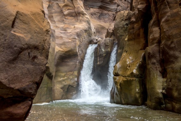 The fall was the perfect spot to take a break and enjoy the ambient sound of water cascading into the river. There was a pool just below the fall that was deep enough to jump into (feet first at least), so we found a spot on the cliffside that we could jump from. We also made our way behind the waterfall by hugging the canyon wall and pushing through the wall of tumbling water. Once inside, we were in a hidden cove, where the guys jumped from a large boulder into the stream of the falls.