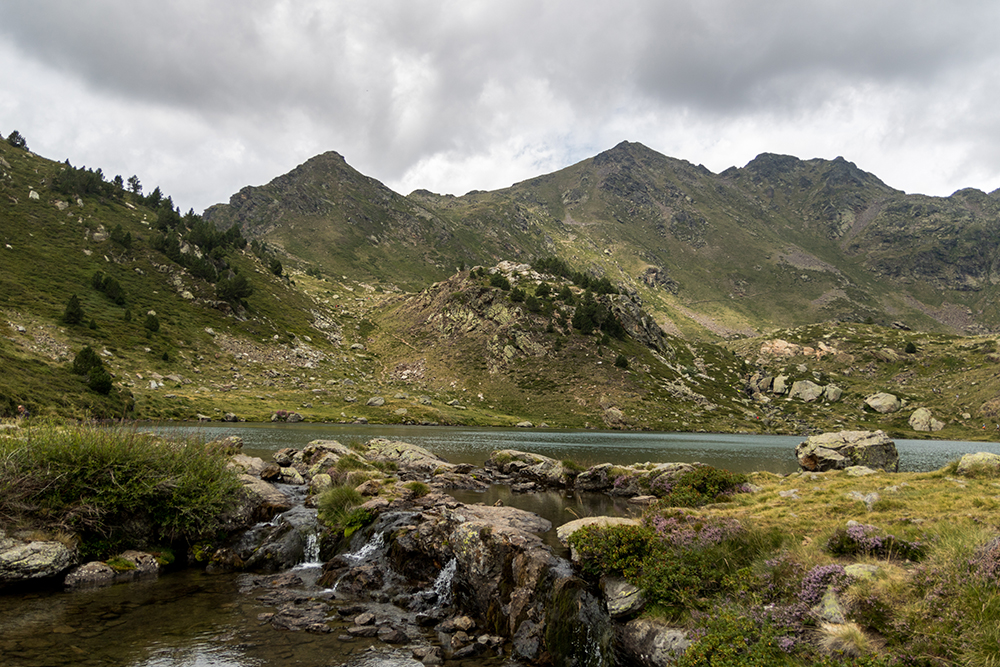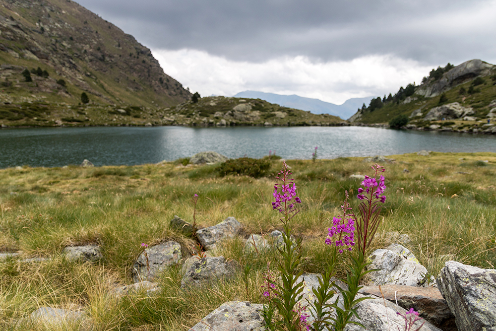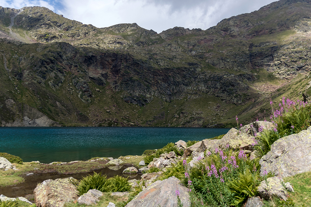 Eventually we made one last steep, uphill push that brought us to the first lake, the aptly named Estany Primer. It was surrounded by tall peaks, and fringed with vibrant, pink flowers.