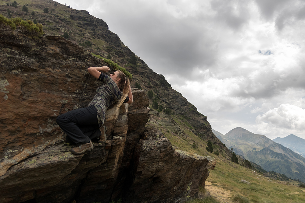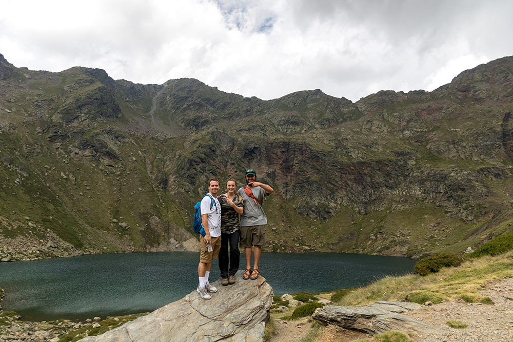 We took a break on the shores of the lake to eat some snacks, scurry up a boulder, and take a group photo before trekking uphill to the also aptly named Estany del Mig.