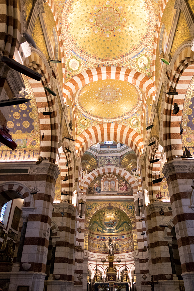 Inside, Notre-Dame de la Garde was different from any of the other cathedrals we had visited. It had a festive design with a bold striped pattern and gilded elements. Little boats hung in strings from the ceiling, and intricate mosaics adorned the walls.