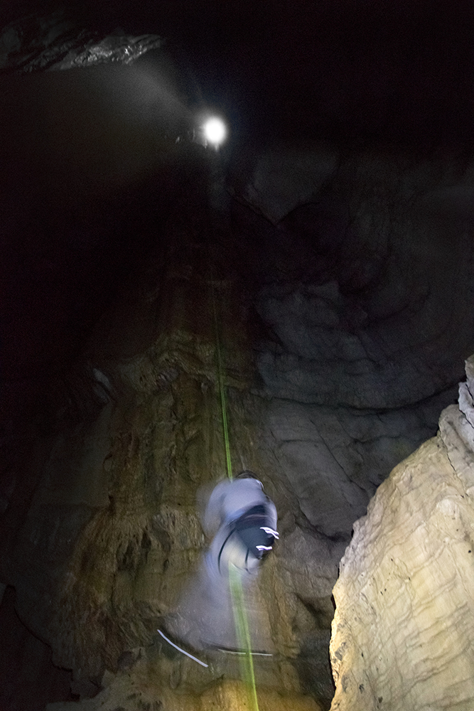 One by one, we would rappel into the cave, then shed anything we didn’t want to carry (harnesses and my camera), and attach those items to the end of the rope so we could pull them up later. We would also leave an ascender at the base of the rope just in case we couldn’t find our way to other entrance. That way, we would be able to escape by going back up the rope, which wouldn’t be ideal, but would definitely be preferable to being trapped in a cave.
