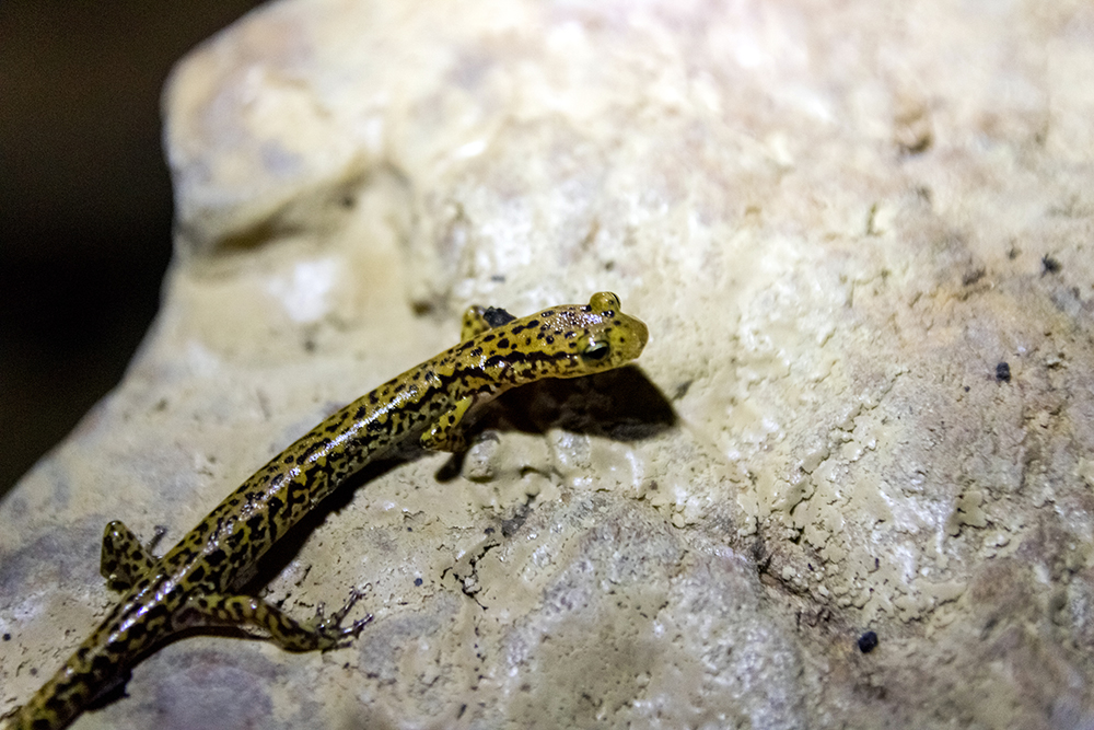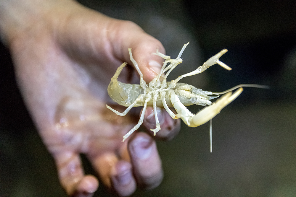By the time Jordi and Anthea had joined us I was set up, and we used Jordi’s headlamp (which is so powerful it’s basically as good as sunlight) to illuminate the inside of the dome. After gaping at the cave entrance in a dizzying disbelief that we’d actually rappelled down from the top of it, my focus shifted to a nearby pool of water. Someone had already found cave creatures and we all huddled around to take a look.