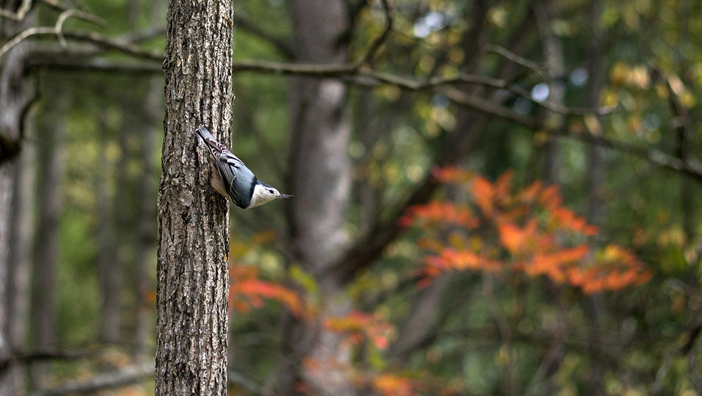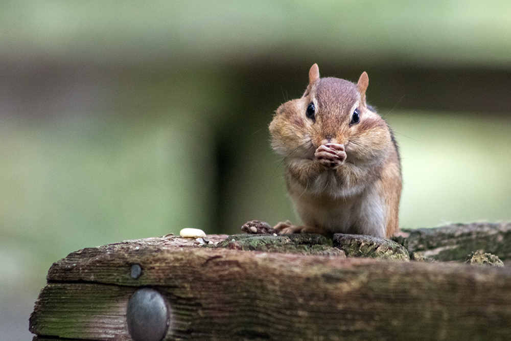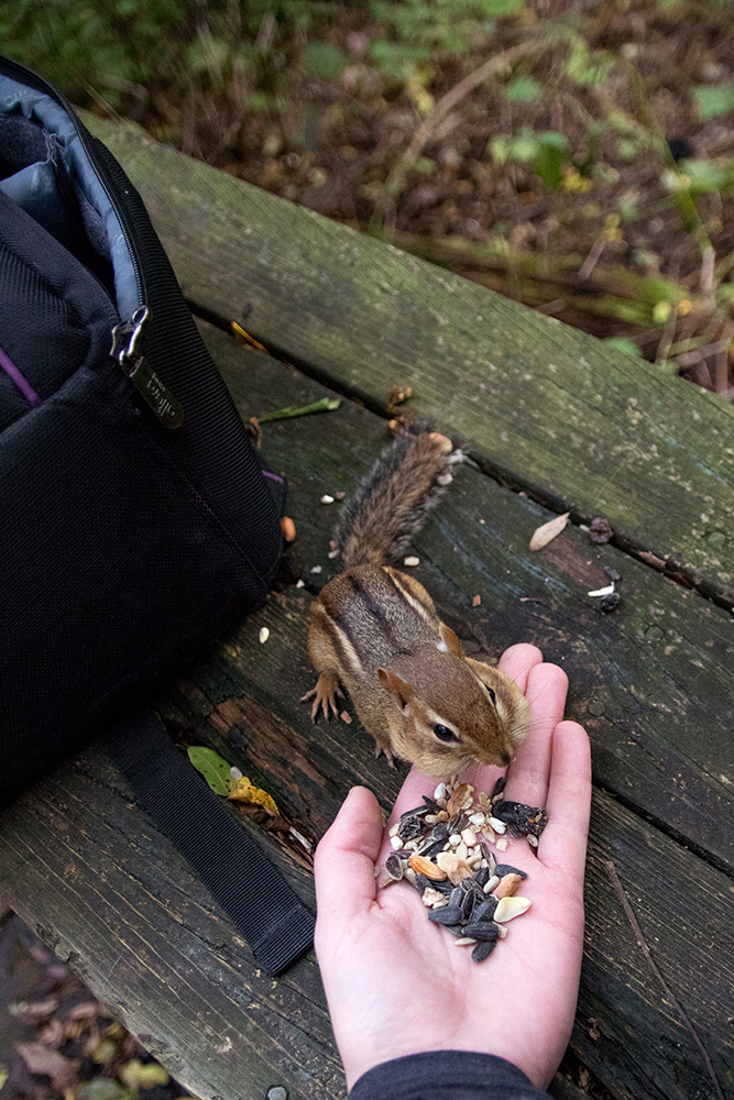 As we entered a forested area we began to notice chipmunks darting about in every direction, and more birds fluttering in the trees. We came across some benches and sat down, filling our hands with bird seed. Within moments, a chickadee and a tufted titmouse were fluttering around my hand, landing for split seconds at a time to grab some seeds before disappearing back into the trees.
