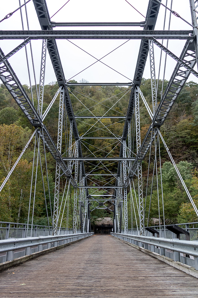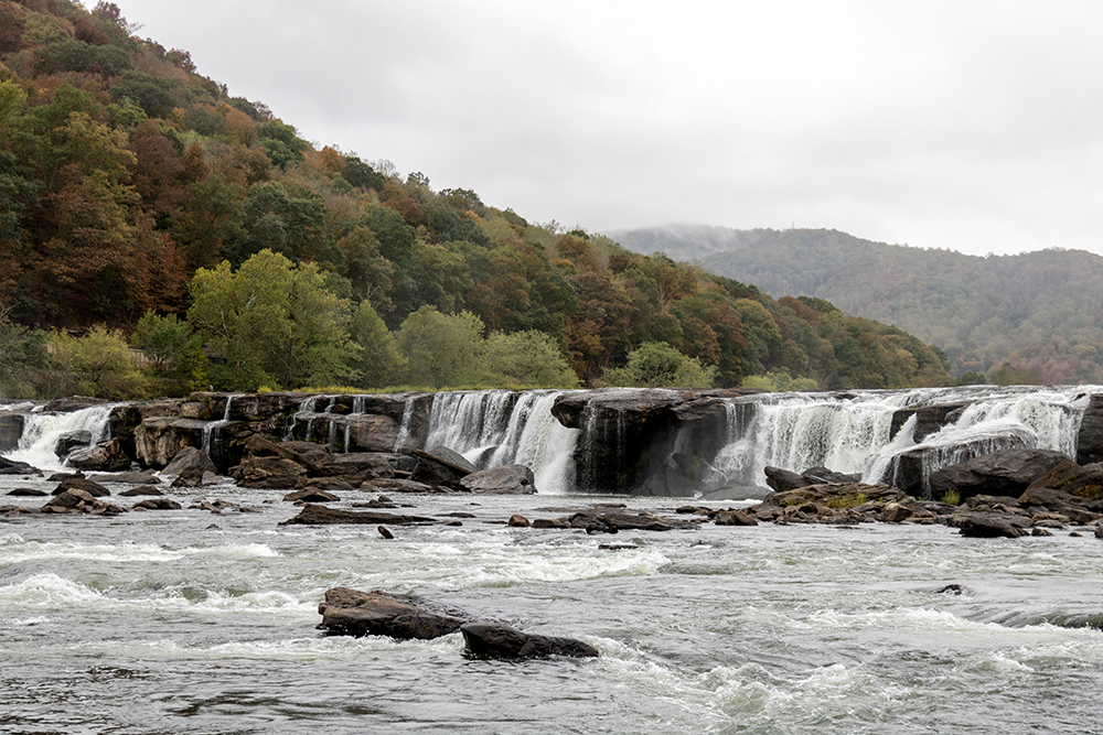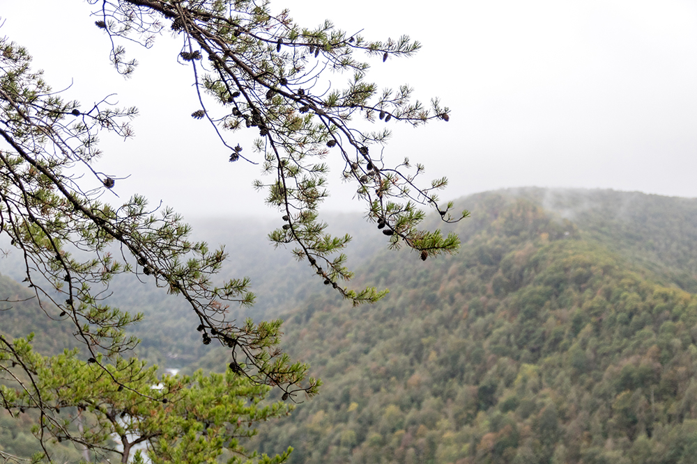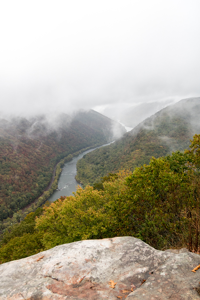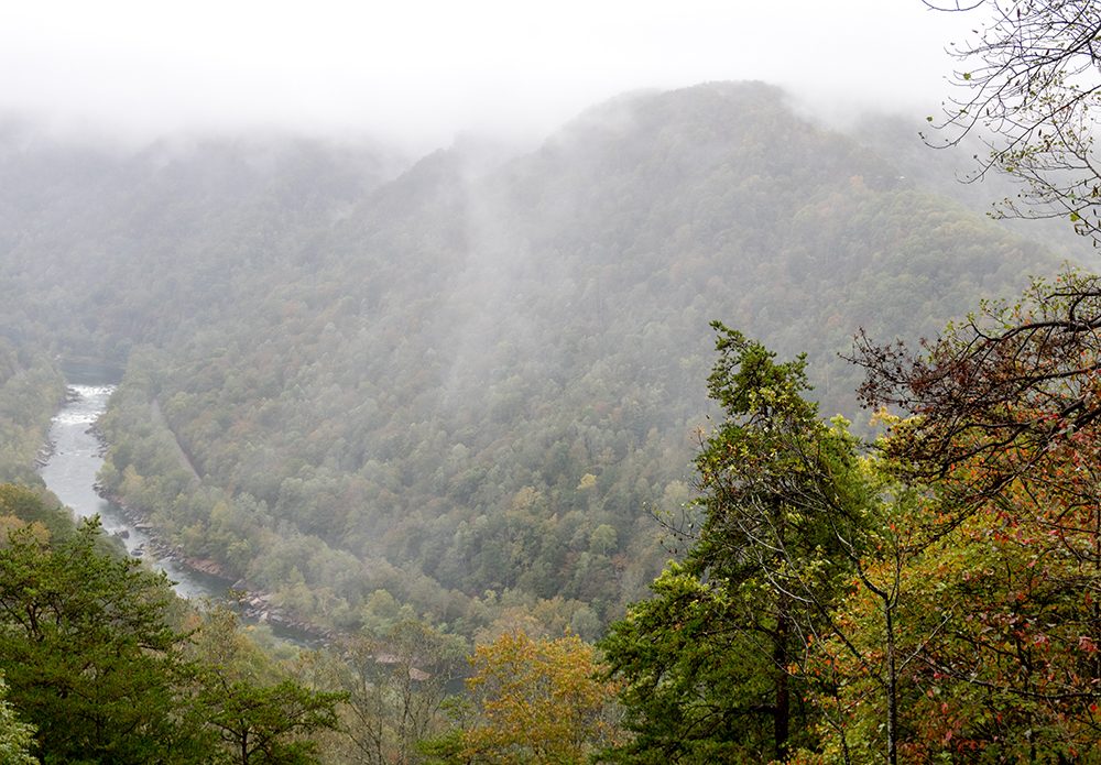 We decided to drive south, stopping first at a scenic overlook called Grand View. This spot gave us a beautiful unobstructed view of the New River snaking through the gorge, where fog rolled over the hills dramatically.