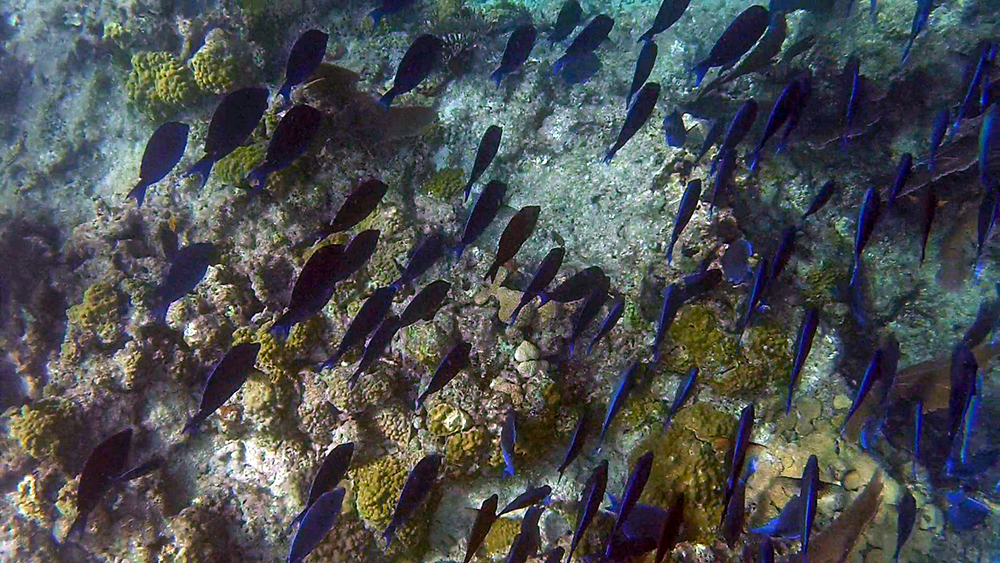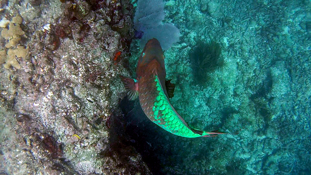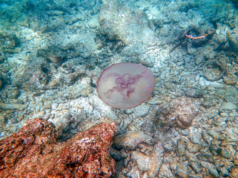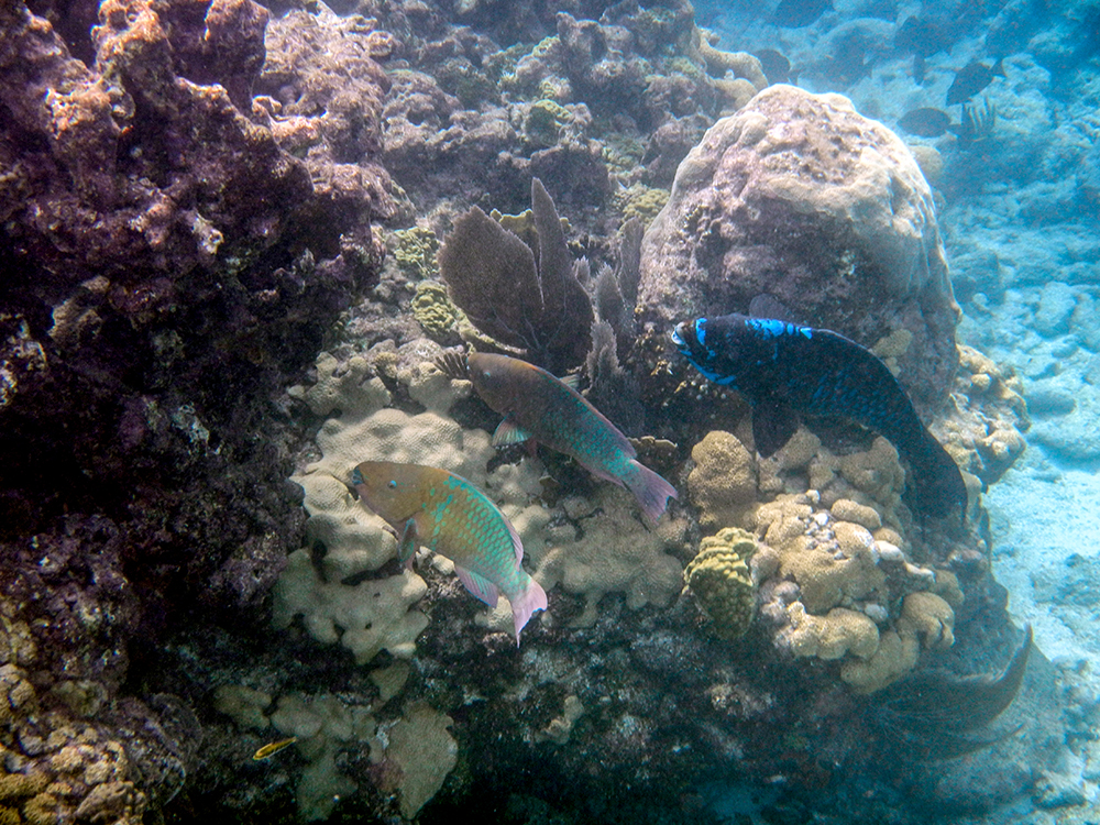 The ocean was also teeming with many kinds of fish I had never seen in person before. During our couple of hours in the water, I saw grunts, damselfish, at least three species of parrot fish, moon jellies, and a French angel fish. Possibly most intriguing though, was a massive school of Atlantic blue tang. There were far too many of them to count, and watching them all move in one big group was mesmerizing.