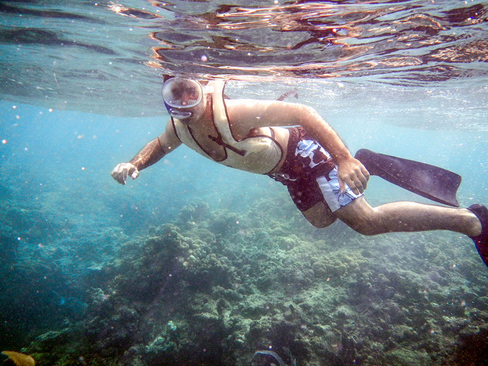 I only half listened to the snorkeling safety briefing when we finally reached the reef. I already had experience with snorkel gear from me and Vince’s previous cruise (It’s super strange to think about being new the snorkeling now that we are SCUBA divers), so I was ready to jump into the water. After the briefing, the crew passed around masks, snorkels, fins, and inflatable life vests, and let us loose to explore finger reef.