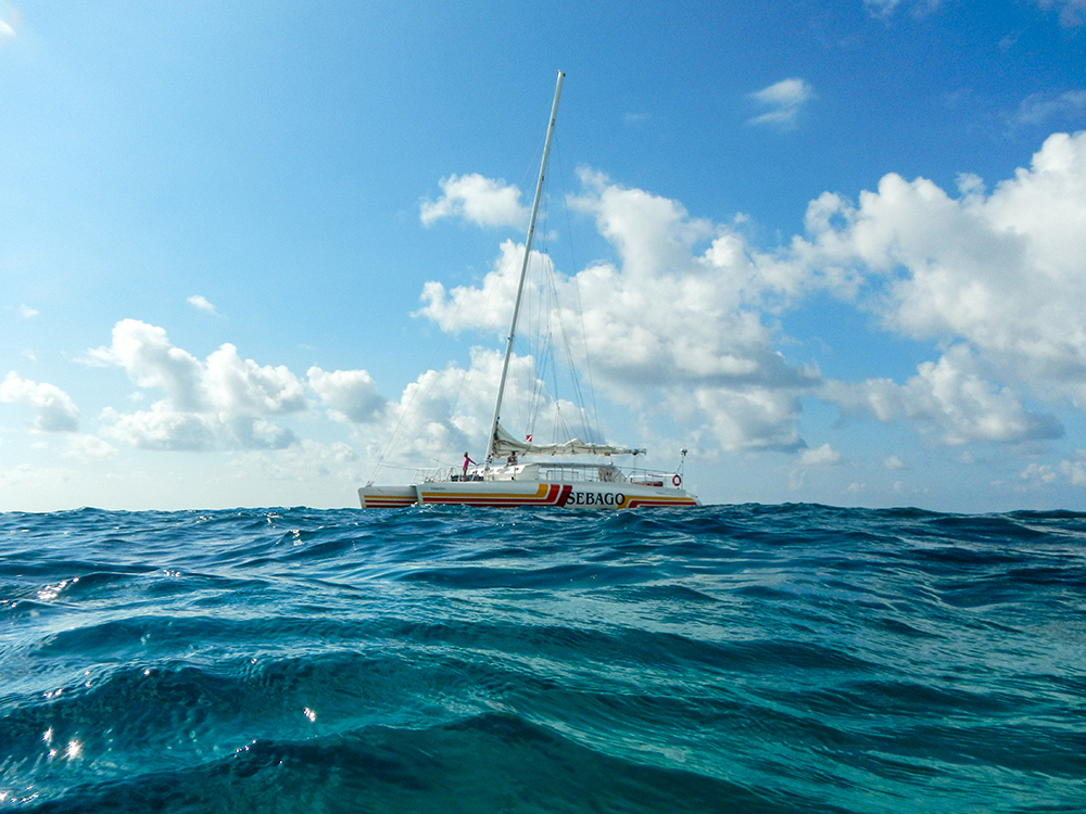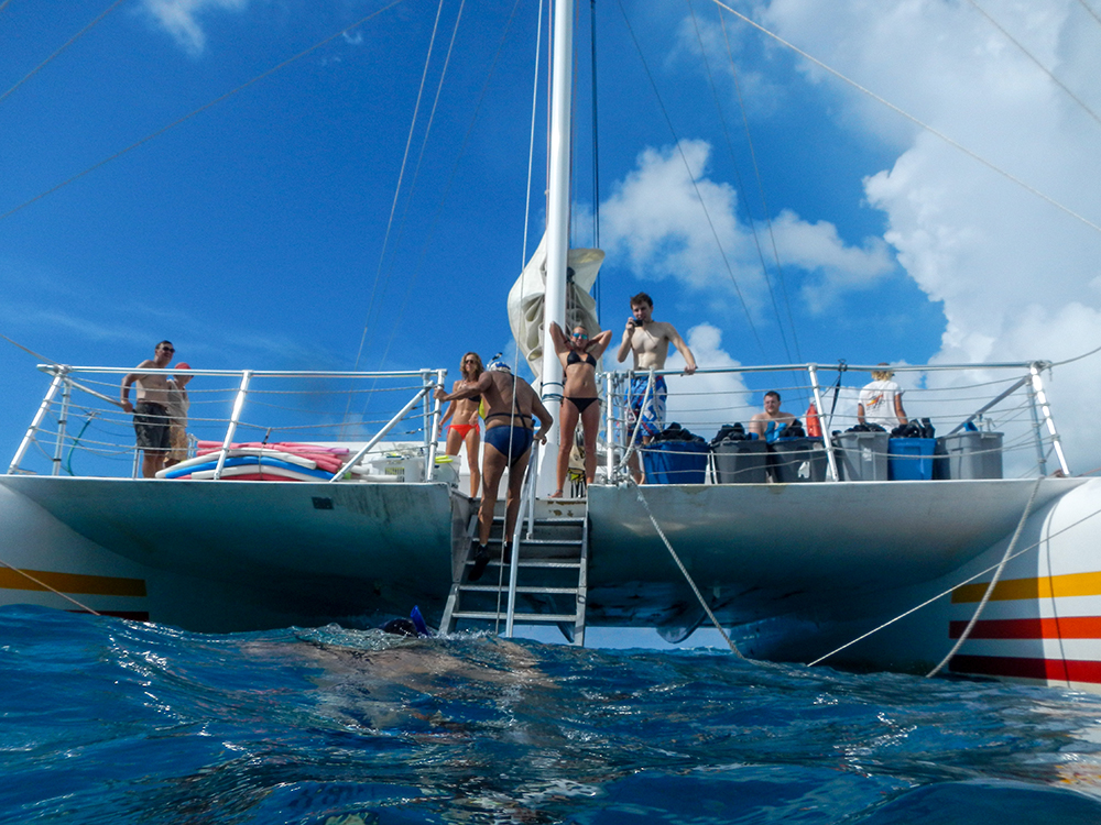 Now this was during a phase where I was even more obsessed with marine life than I am now (which believe me, is a borderline unhealthy level of enthusiasm as is). I could barely wait to be in the ocean swimming amongst fish and corals. Fortunately, the reef was only a relaxing catamaran ride away, and we got to soak up some sun on deck and marvel at beautiful, turquoise waves as we neared our destination.
