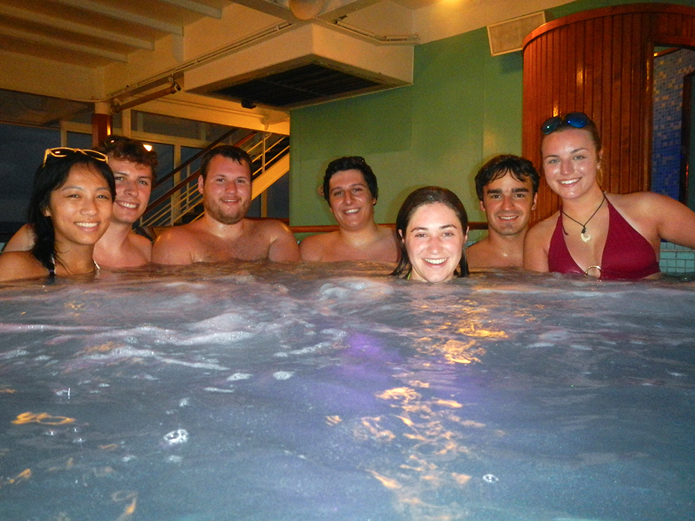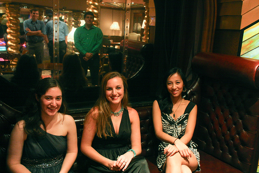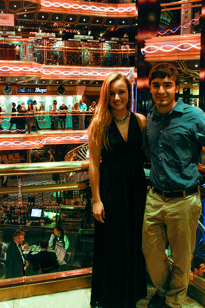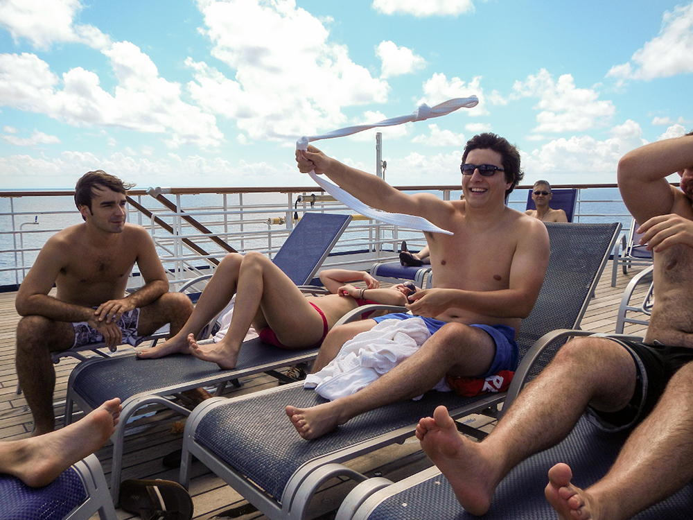 Even though I’d only met everyone in the group on a couple of brief occasions before the trip, it soon became clear that Andrew, Amy, Bonnie, James, and Max were a fun group of travel companions. We spent our days on board the Imagination dancing in the pool, hogging the hot tubs on the serenity deck, eating way too much food, and attempting to lasso drinks with our bathrobe ties. On the night of the cruise’s designated formal dinner, we got dressed up and completed our looks with sunglasses and bandana headbands. We even posed for one of the ship’s professional photographers against an entirely unexplainable front porch themed backdrop.