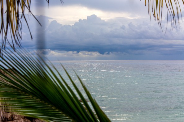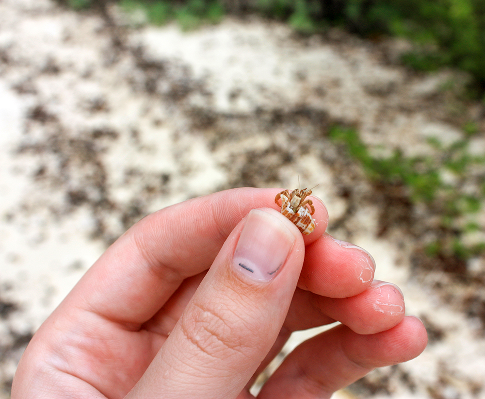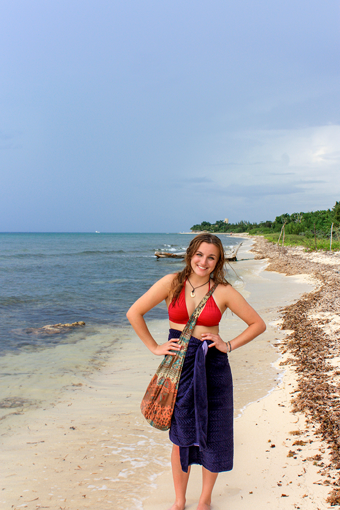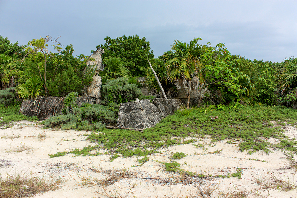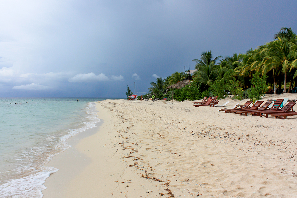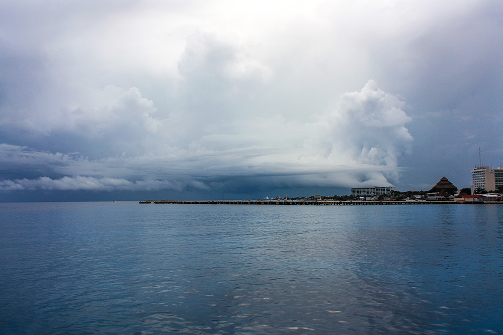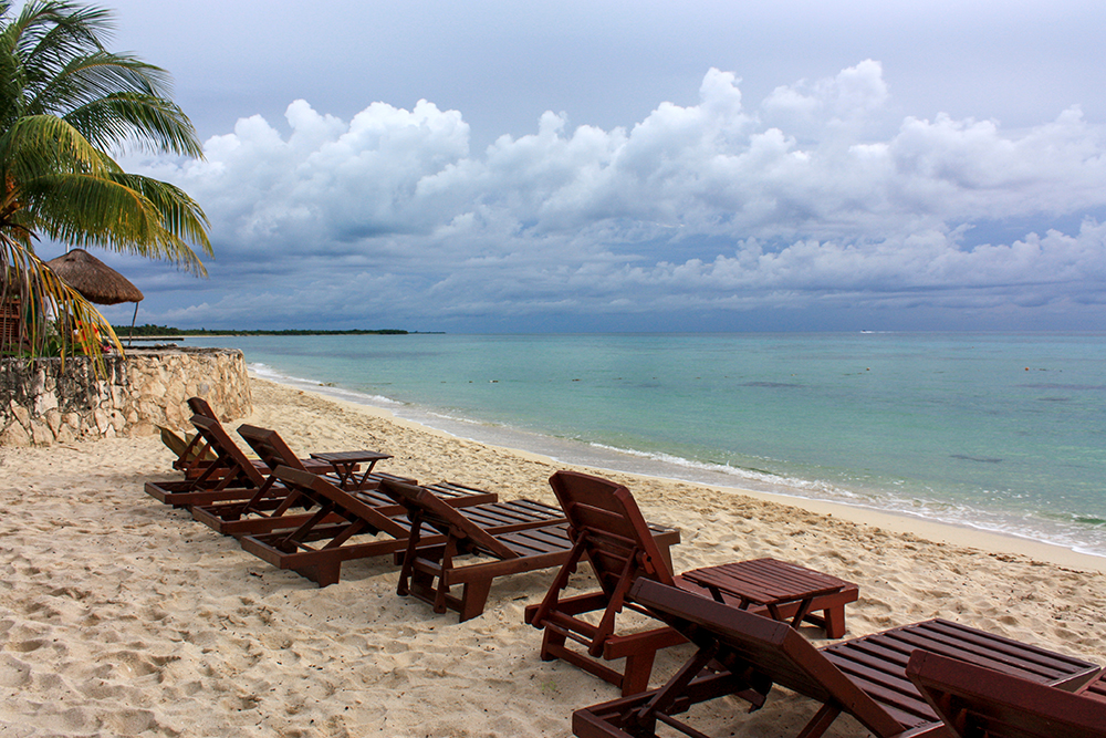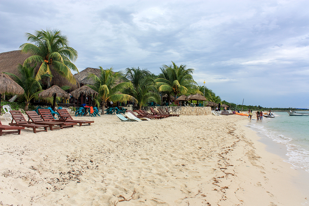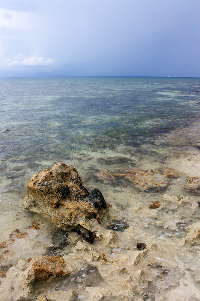 Once we were back on shore, we still had plenty of time to enjoy the beach, so we took a walk along the shore. Beyond the manicured parameters of Playa Palancar, the beach was more rocky and wild. There were some stone ruins back in the forest, and little hermit crabs skittered about near our feet. It was clear that a rainstorm was building because dark blue clouds had rolled over the sky.