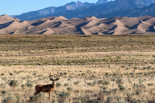 It was a good decision to arrive early. There were very few other cars heading our way when we arrived and snagged our obligatory park sign photo. The air was still cold-great for hiking- and it was early enough that mule deer were still milling about the grasslands that sprawled out in front of the massive dune field.