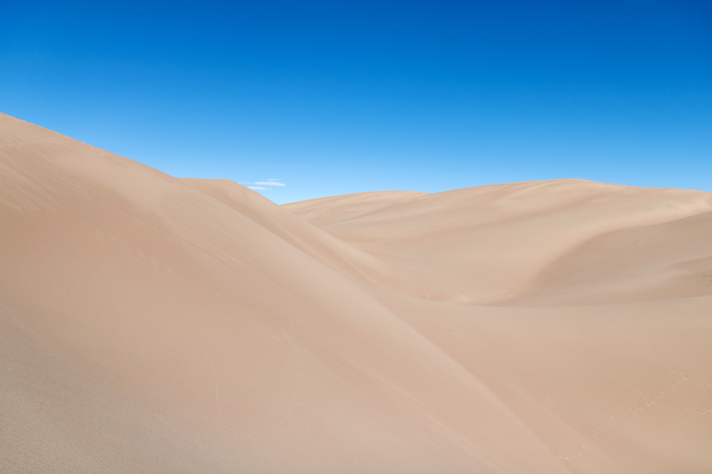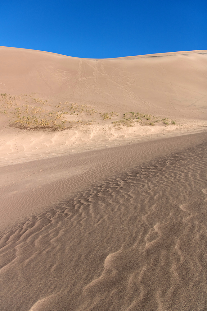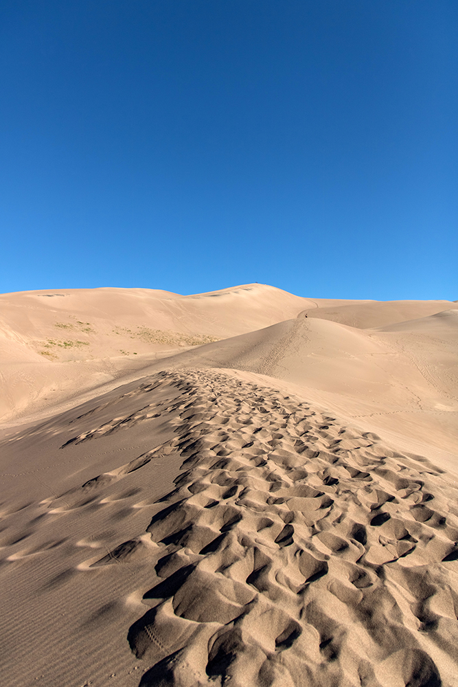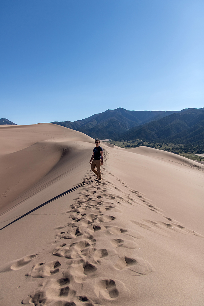 I hadn’t come all this way just to look at the thing, so I grabbed my trekking poles and Vince and I began the arduous but familiar task of sand hiking, which is best described as regular hiking, but ten times more annoying. As we walked I was impressed by how alien and downright unreal the dunes looked. Anywhere where footprints existed made sense to my eyes, but any fresh, untouched sand looked like some sort of glitch or optical illusion. It was simultaneously beautiful and strangely difficult to look at, as though my brain couldn’t figure out how to interpret what my eyes were seeing.