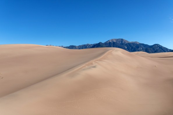 With experience on our side, and the lingering cool morning air, it didn’t take long for me and Vince to crest the top of the first dune, and the view we found was nothing less than spectacular. Mountain peaks loomed behind the north end of the dune field, but if you looked west, the only thing to be seen was pristine, untouched dune that looked to clean to be reality.