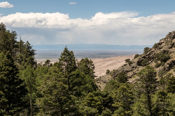 We decided to hike the Mosca Pass Trail, a 6.4 mile out-and-back trail with 1,459 feet of elevation gain. It wasn’t the most exciting trail I’ve ever hiked, but the constant ambient smell of pine resin baking in the sun was pleasant and it wasn’t very heavily trafficked, so Vince and I once again were able to enjoy a nice, quiet hike that put my leg to the test. This was by far the most elevation gain I’d attempted since the accident, and perhaps more importantly, it was also the most elevation loss. When it comes to knee pain, downhill hiking it always worse, so I made it up the trail without incident and then I struggle-bussed the entire way back down. We only stopped briefly to admire the one viewpoint the trail had to offer-a glimpse of the dunes from the canyon we were hiking through.