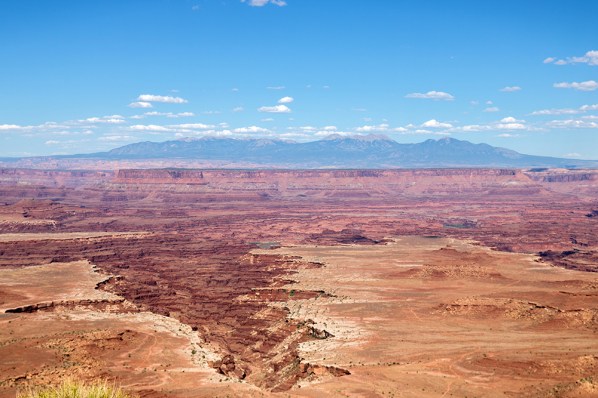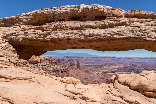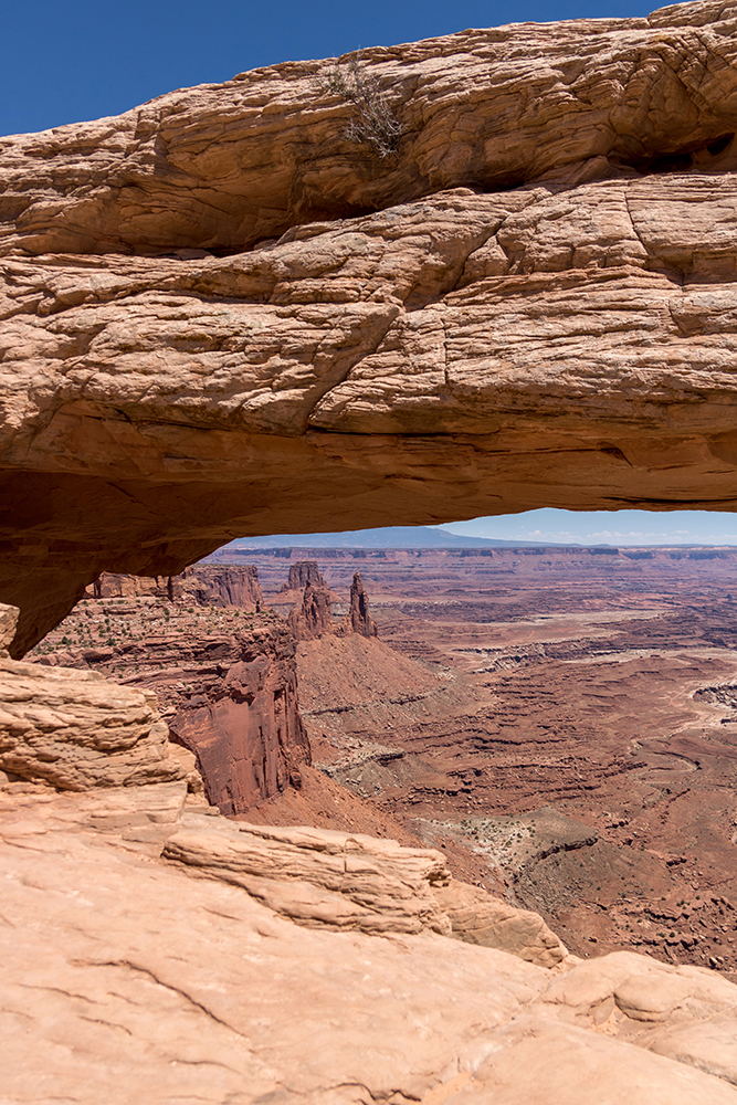 By the time we finally arrived at the Island in the Sky District, I had picked out a couple of hikes from the park map. The first was a short and easy trek out to Mesa Arch, a picturesque natural arch on the precipice of a staggering cliff. The arch serves as a built in picture window for viewing a vast canyon that stretches toward the distant La Sal Mountains.