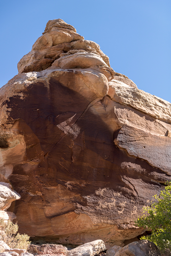 Eventually we got up and started the trek back to the parking area. This time we stopped at an offshoot of the trail that led to a rock with fanciful looking carvings of bighorn sheep, horses with riders, and some sort of dog. This Ute artwork was carved at some point between AD 1650 and AD 1850.