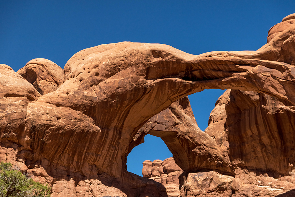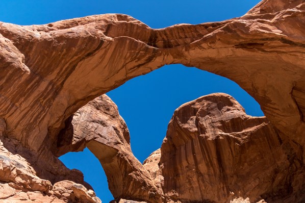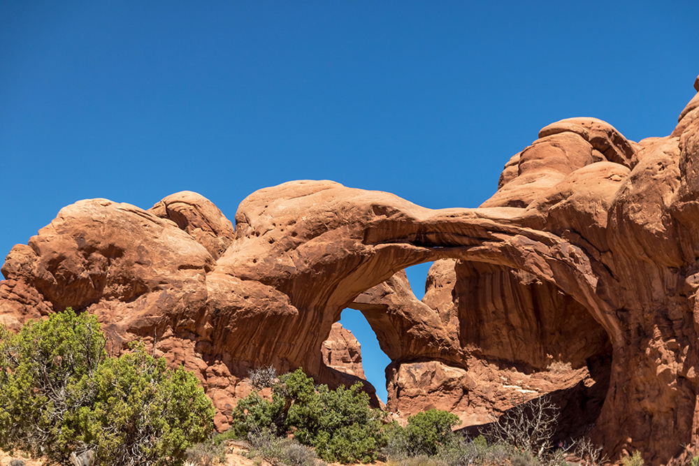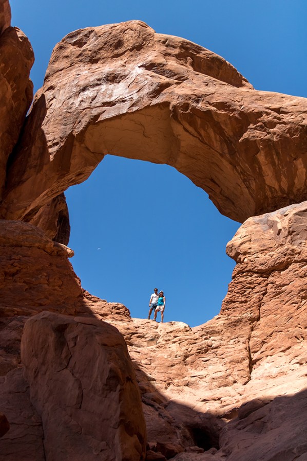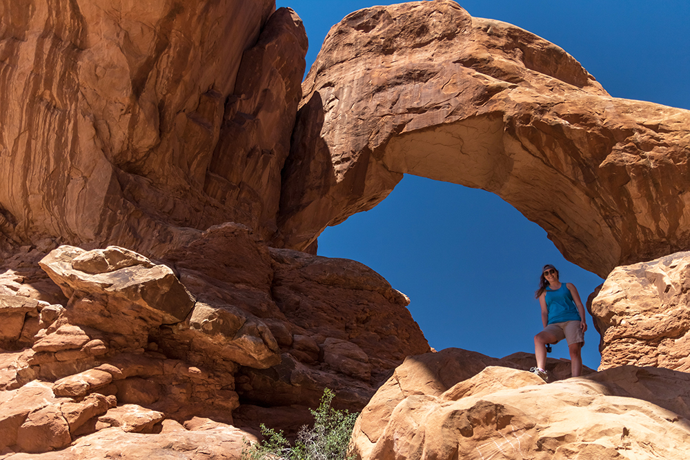 Our parking spot was closest to Double Arch Trail, so that’s where we started, hiking an easy quarter mile to the base of what would be my favorite of all the arches we’d see that day.