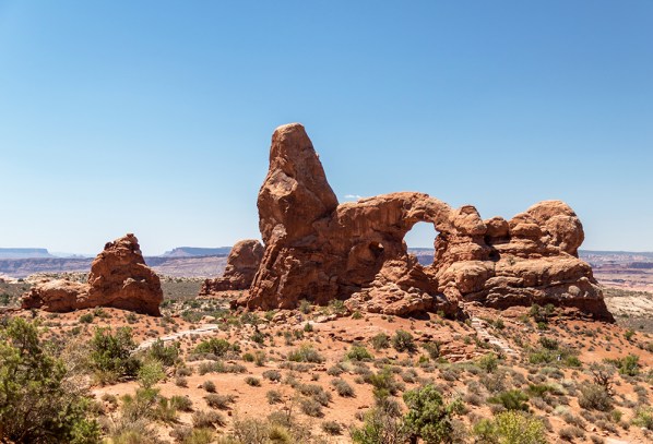 Next up, we walked to the other side of the parking lot to the Windows Trail. By this time, the intense heat was starting to wear me down, but I tried my best to still appreciate the beauty of the trail despite feeling utterly exhausted. We made brief stops at the North and South Window Arches, but I was more intrigued by Turret Arch, which rose from the desert in the opposite direction.