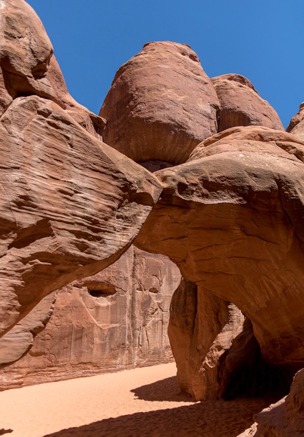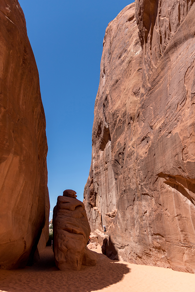 This short, but alluring trail of soft, red sand cut through a narrow opening between towering fins of rock. The trail dead ended shortly beyond Sand Dune Arch, which was a smaller arch in a more intimate setting. There were few other hikers in the area so it felt peaceful and quiet, and took me back to exploring the red desert of Wadi Rum.