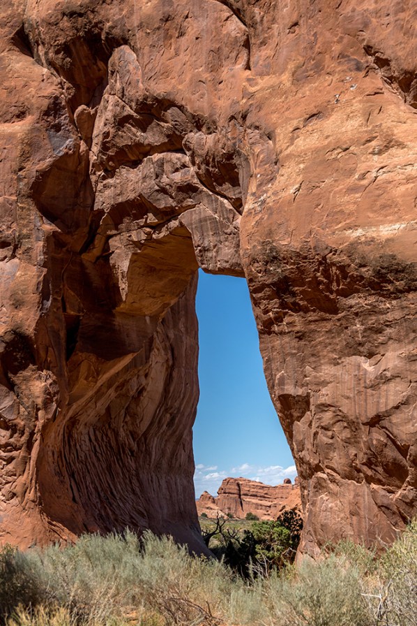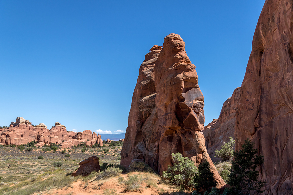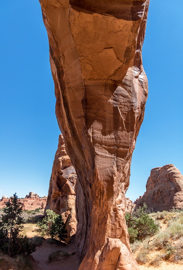 The Devil’s Garden area ironically reminded me of Garden of the Gods in Colorado Springs. The landscape was mostly filled with large red fins rising out of scrub grass. Pine Tree Arch was carved out of one of these fins.