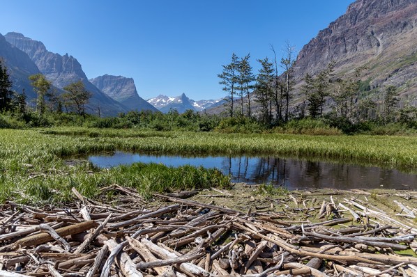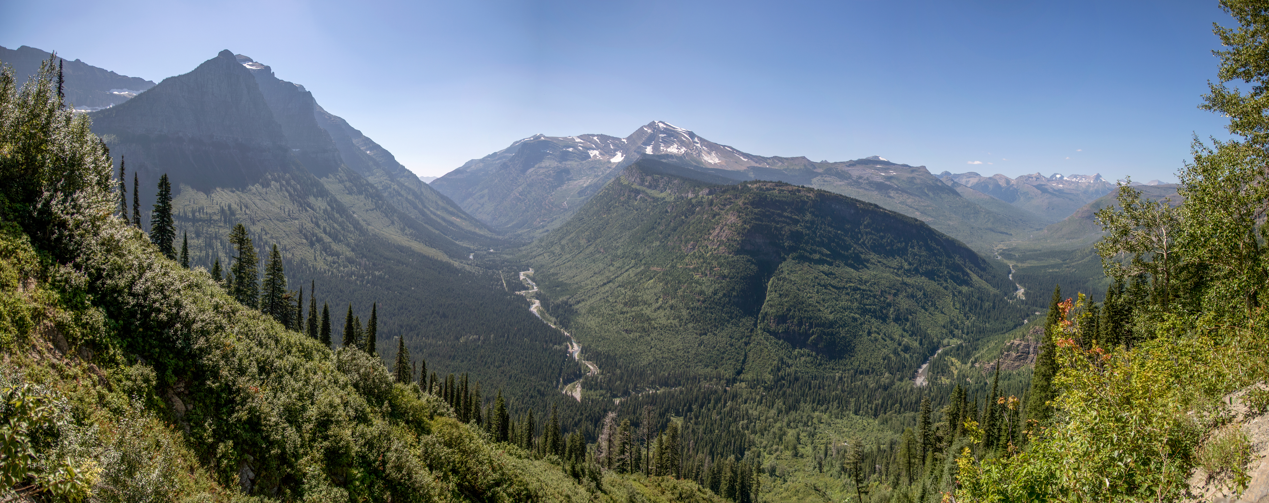 You can’t talk about Glacier without talking about going to the sun road. Every winding turn on this highway offers a different incredible view, and there are even waterfalls cascading down cliffs right on the roadside. The scenery began to change as we got further east. What had been valley views gave way to a view of St Mary Lake. We even saw a black bear chewing on branches right along the roadside. We made stops at various scenic overlooks, and walked down to the edge of the lake. After spending the previous seven days traversing through plains, scrublands, desert, and volcanoes, the verdant landscape of Glacier was a welcome sight.