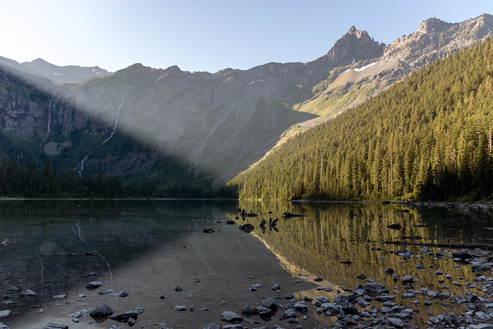It wasn’t long before we arrived at Avalanche Lake, which offered a quick explanation as to where all of the people who’d parked at the trailhead were. We masked up before heading to the lake’s shore to watch the sun creep up over the mountains, casting an ever widening beam of light over the landscape. Thankfully we were still able to keep ourselves distant from the other hikers, and everyone there was in a subdued mood so the atmosphere was still peaceful.