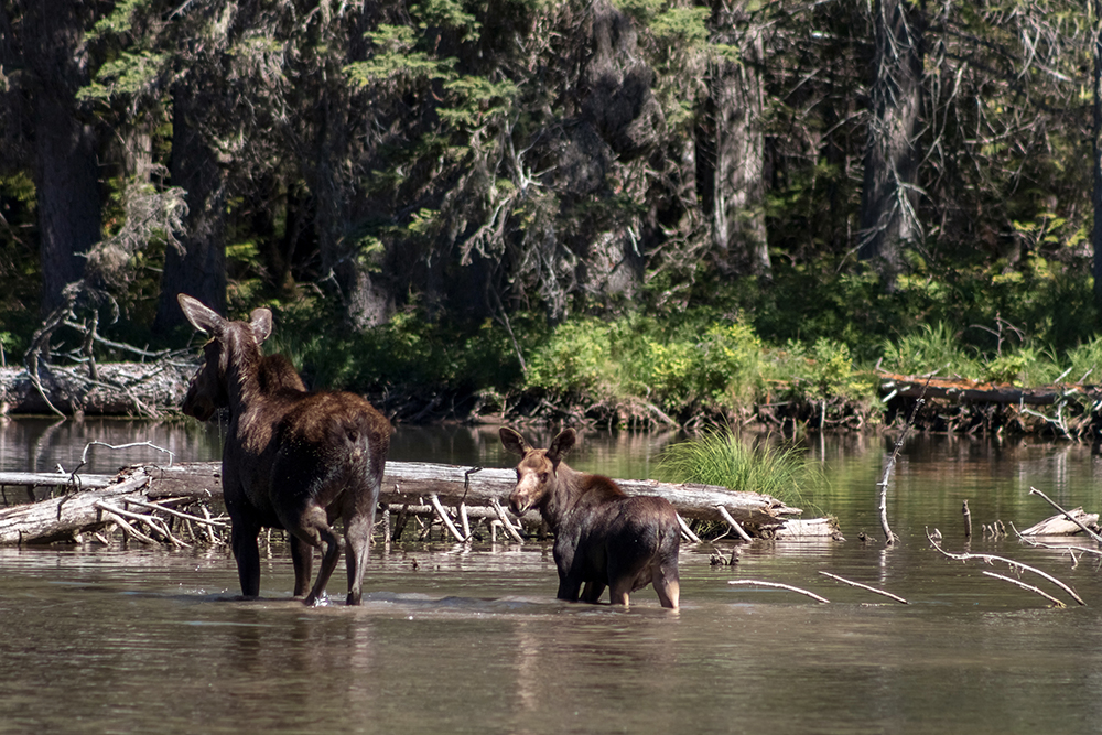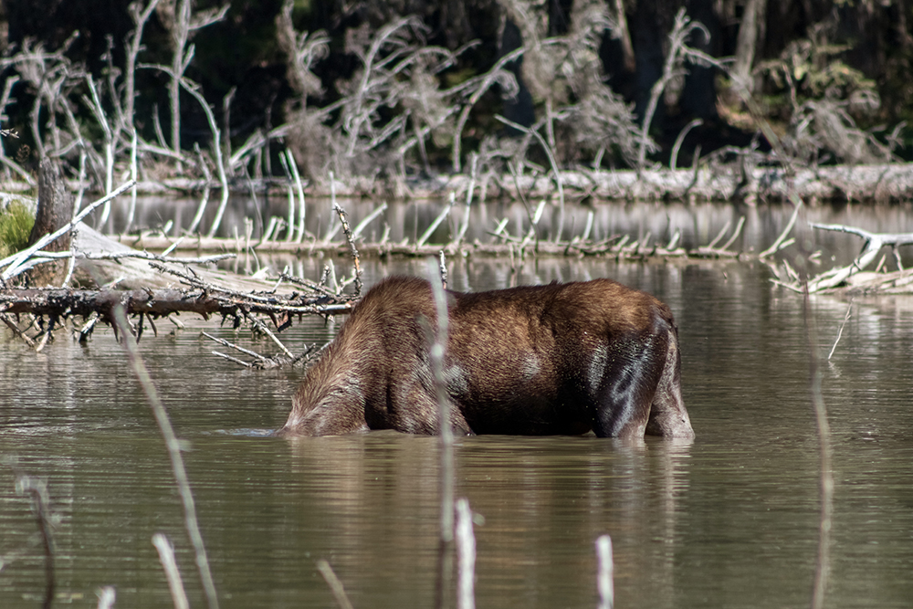 Her antics were thoroughly exciting for me because I always feel that its special when you get to witness unique wildlife behaviors. Momma moose just kept dunking her head underwater, and Vince and I quietly enjoyed the show until eventually the calf emerged from the forest and waded out into the river to join her.