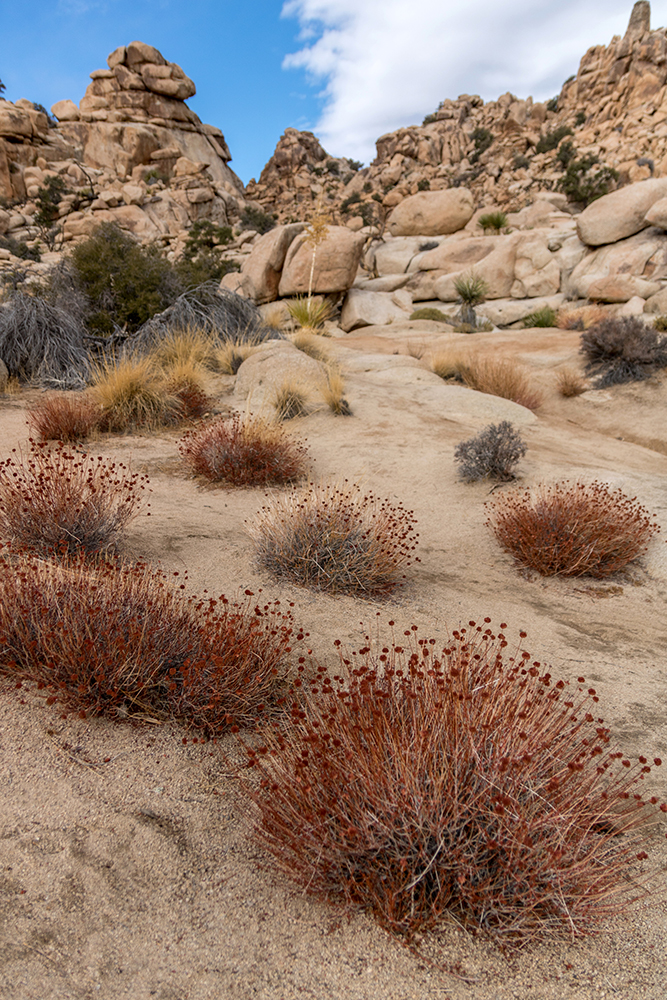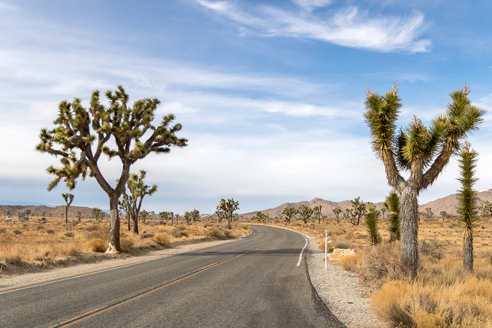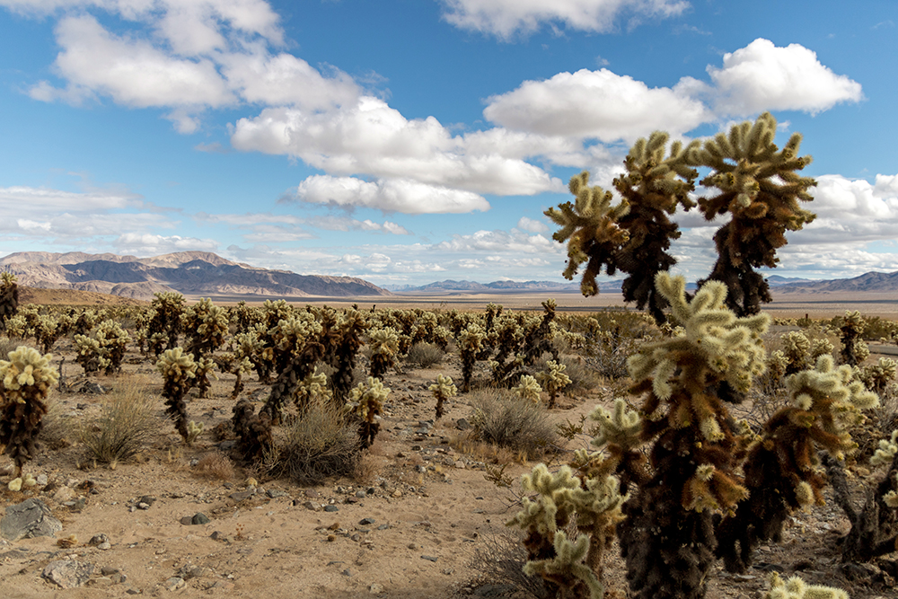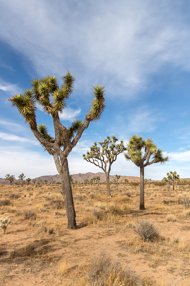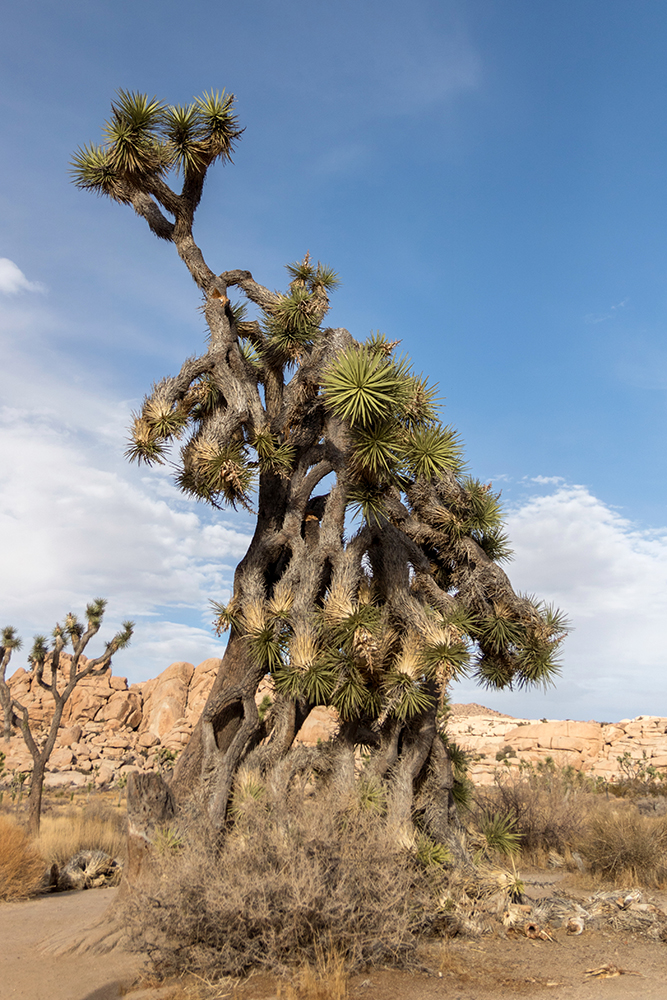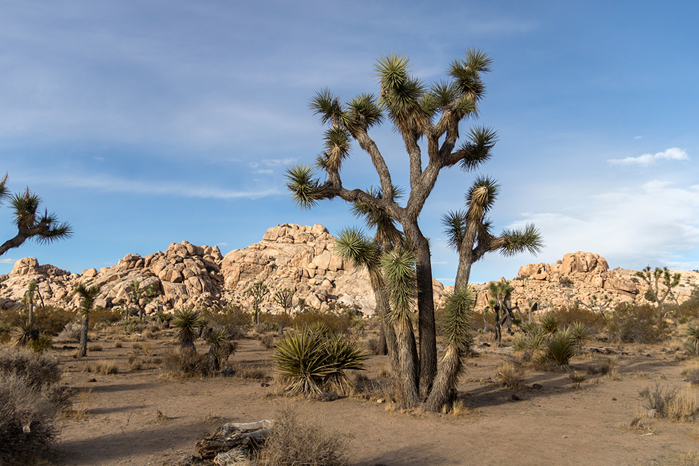 Cloud cover gave way to brilliant sunlight as we continued further into the park. The road was bordered by fluffy looking Joshua Trees, their whimsical arms stretching toward the sky.