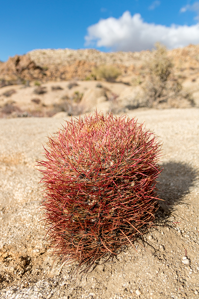 Although we knew we wouldn’t make it to the Lost Palm Oasis, we did follow the trail uphill a bit further, and found more ocotillos, along with some barrel cacti, and got to see a beautiful view from the hilltop. Cottonwood springs was still visible, but now the massive palms looked tiny in the distance.