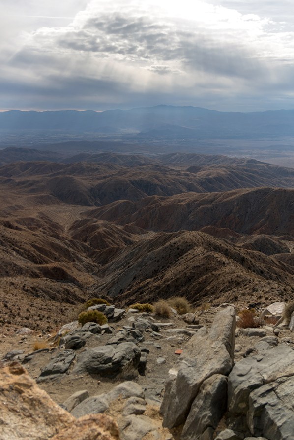 We were on our way to Keys View, one of the most impressive overlooks in the park. This panoramic lookout offers an unreal view of Coachella Valley, and it was made even more magical by rays of sunlight bursting through the clouds.