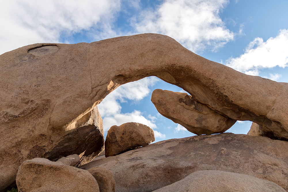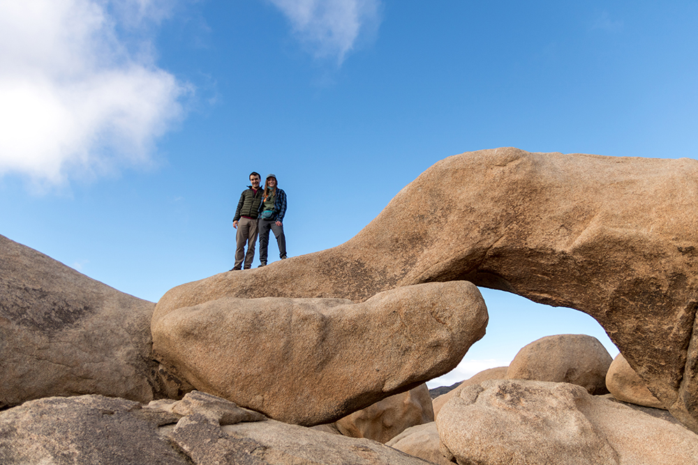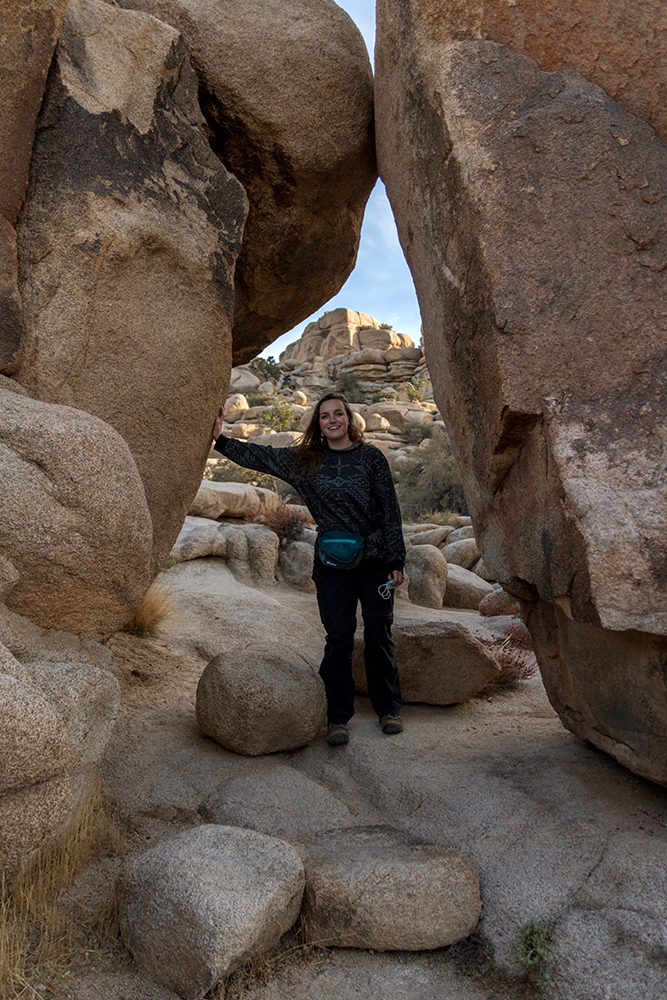Hopping around on the cartoonishly round rocks and route-finding as we went gave me a feeling of unbridled fun. I was really enjoying exploring the rugged terrain, and getting to be with friends and family that I hadn’t seen in a while. It didn’t take long to find arch rock, and Vince took the opportunity to tease me about how much I hate arches, an exaggeration born from a day in Arches National Park when the weather was too hot to be enjoyable. I may have been a harsh critic of a couple of the arches we’d seen in Utah, but this one had a whimsical shape that I enjoyed, and thus received my stamp of approval.