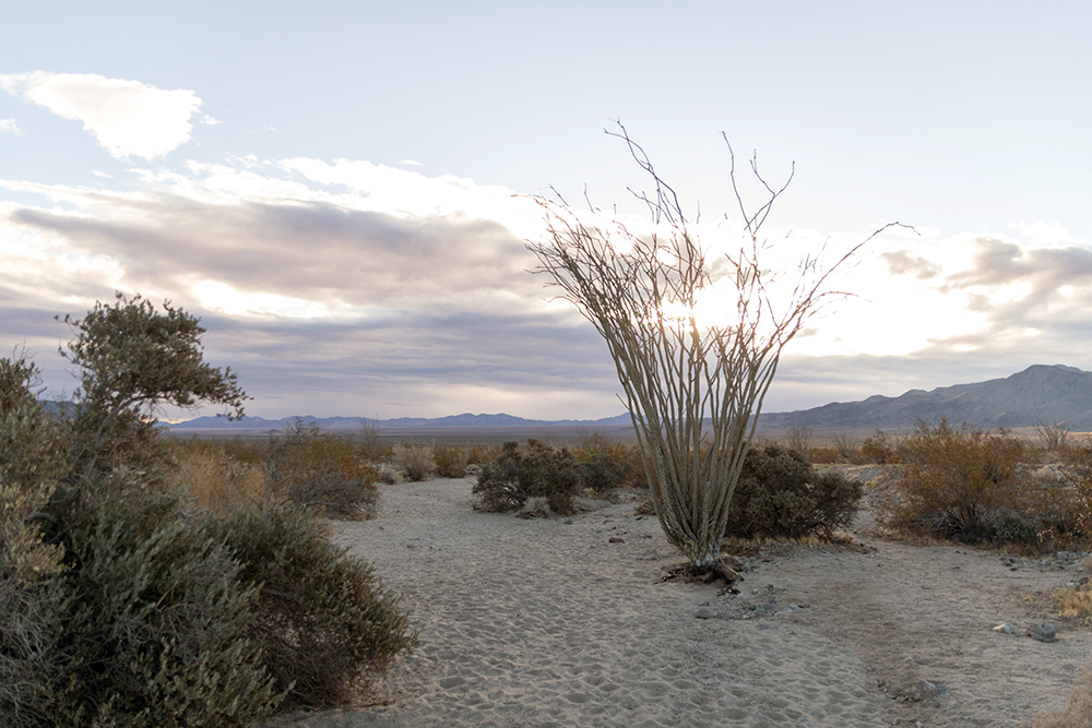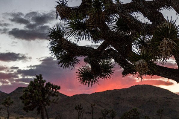 That night was fitful and filled with heavy rain and and strong winds that sounded as though they might blow our entire cottage away. I barely slept at all because of the noise, and I was beginning to suspect that our morning plans would be met with disappointment. We couldn’t just sleep in though, because we had arranged to meet up with our friends Amy and Andrew at sunrise at the Cholla Cactus Garden. It was a lucky coincidence that we would be in Joshua Tree at the same time as them. They had driven down from their home in Oregon and had been backpacking somewhere inside of the park for the past few days. We knew that our trips would intersect, but they didn’t have phone service, so there was no way to contact them to change our meeting time.