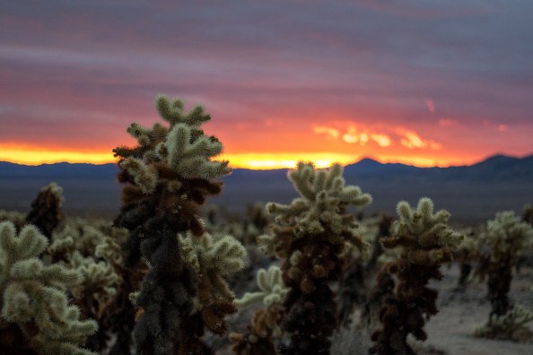 So, after an early wake-up call, we drove back into the park and were excited to see that the horizon was glowing a brilliant pink. Ours was the only car on the road that early, and we made it to the cholla garden to find that Amy and Andrew’s SUV was already in the parking lot, but they themselves were nowhere in sight. Presumably they had wandered into the sea of chollas that surrounded us, and we decided to do the same.