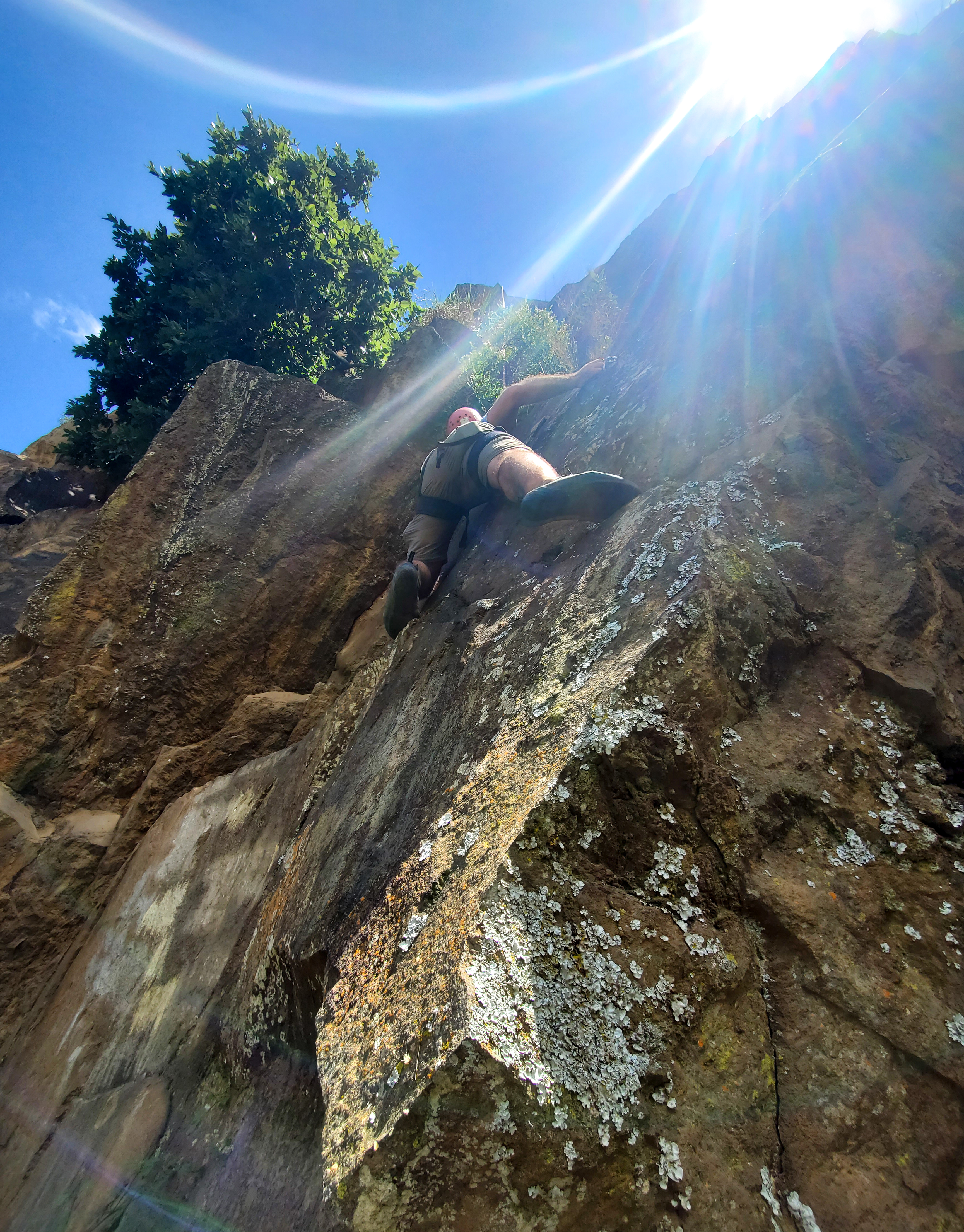 It wasn’t long before we found ourselves standing below a tall volcanic plug called Fischer’s Tower. There was a top rope set up on it, a pile of climbing gear on a shaded picnic table, and a climber ready to rent out gear and belay anyone interested in climbing the pillar. Vince and I talked to him about what routes were there, and he agreed to set a 5.10 for us to follow. I hadn’t climbed a single thing since October (the climbing gym didn’t exactly seem appealing during the holiday Covid surge), so I wasn’t overly confident that I would have the strength to do a two-pitch 5.10, but I definitely wanted to give it a try. Vince went first, and made it to the top fairly easily after a bit of a slow start, and I enjoyed the company of a hoard of rock hyraxes who clearly hoped I had food to offer them.